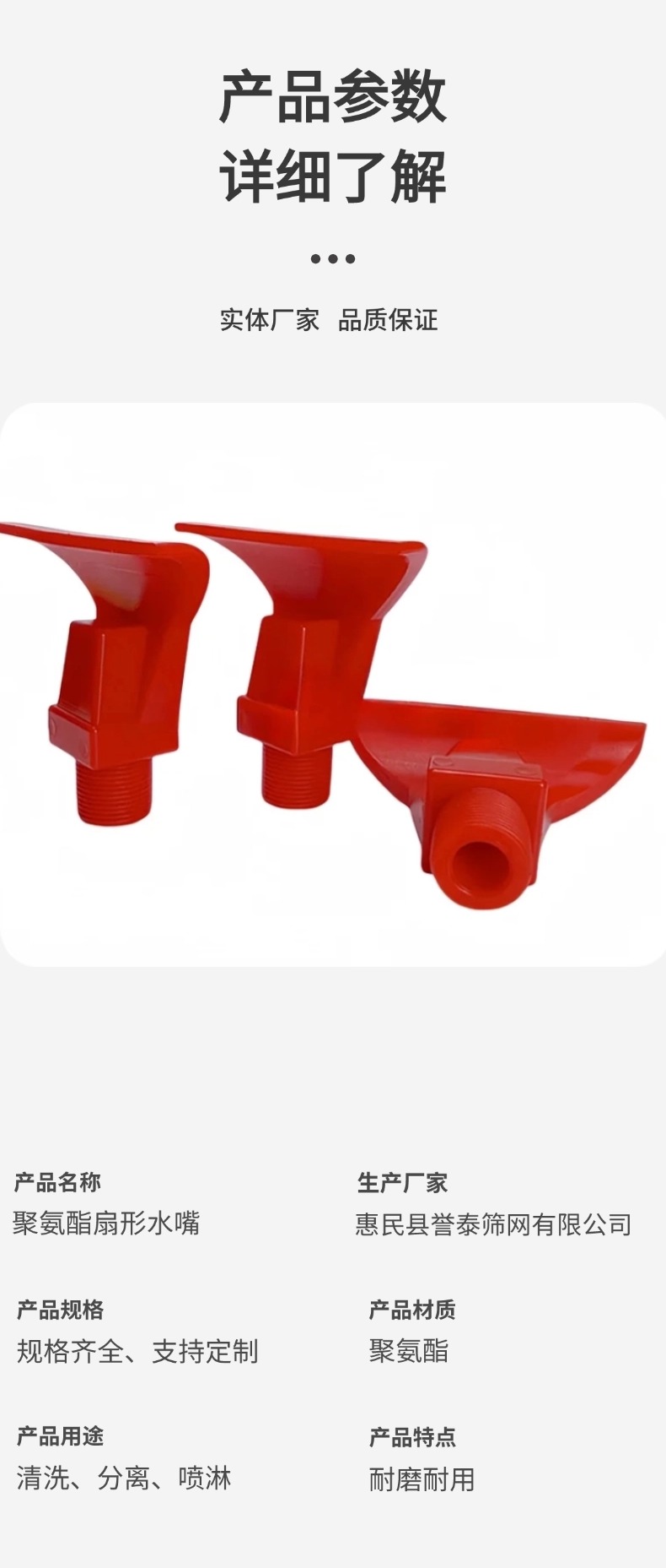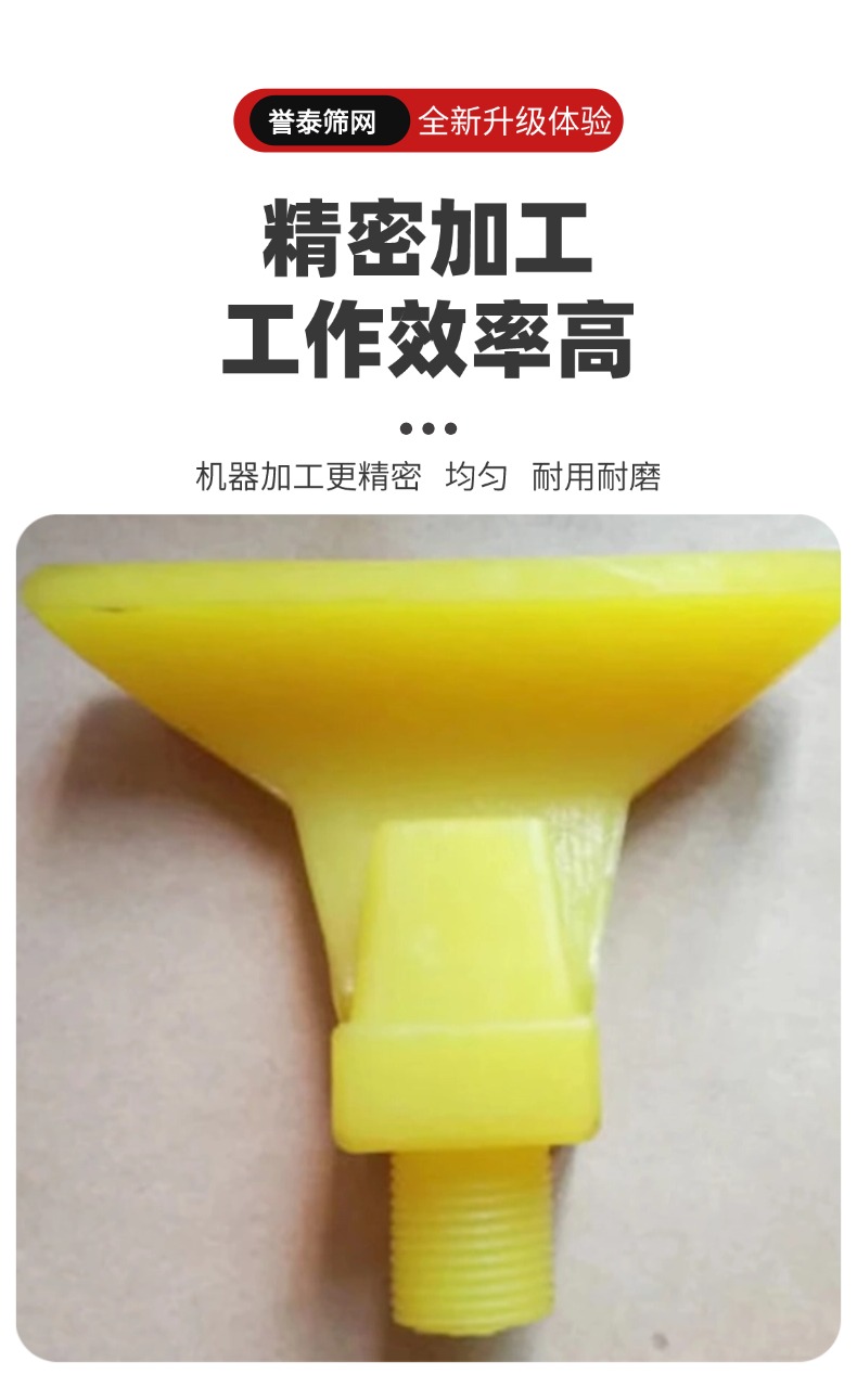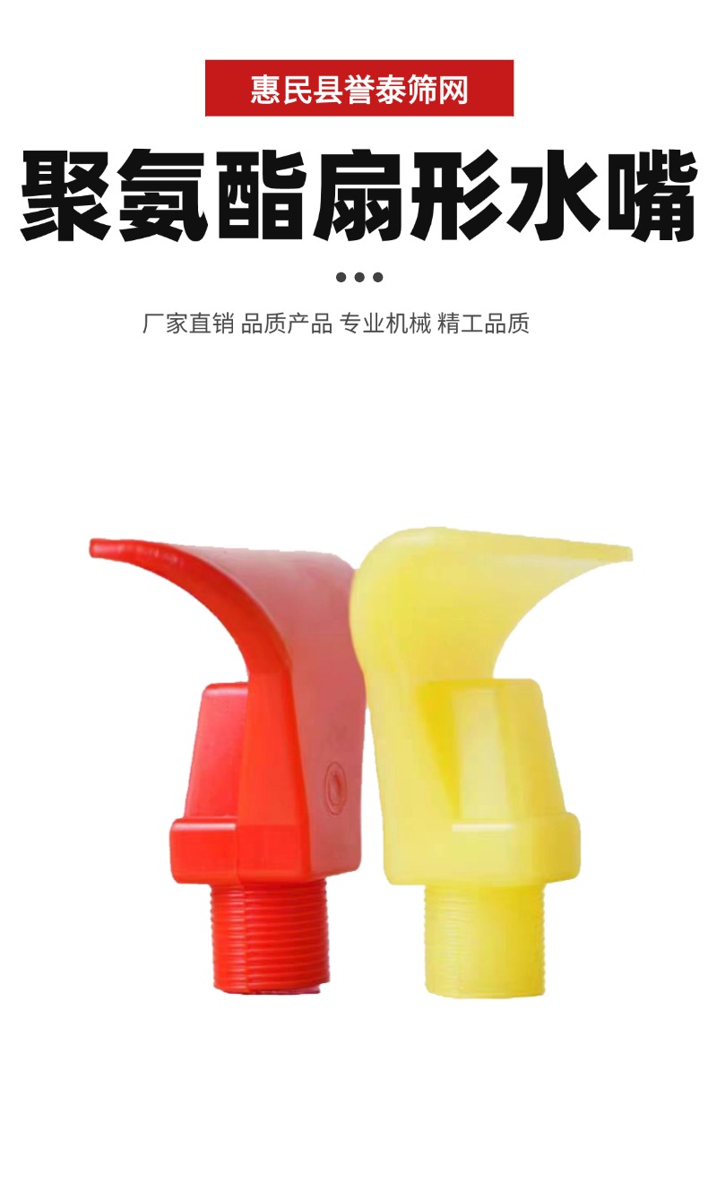 聚氨酯扇形水嘴,以聚氨酯为材质,经先进工艺制成,常应用于工业场景。其呈扇形外观,能将水流均匀分散为扇形喷雾,实现大面积覆盖。它耐腐蚀性强,无惧恶劣环境;耐高压,可稳定作业。在洗煤厂,用于洗煤机、脱介筛喷水,助力煤炭清洗;在磁选机中,借助喷水辅助筛选矿物。此外,还常见于需要喷雾降尘、物料清洗等环节 。