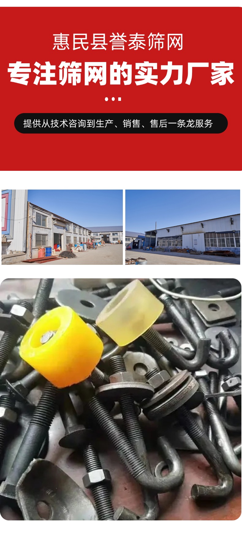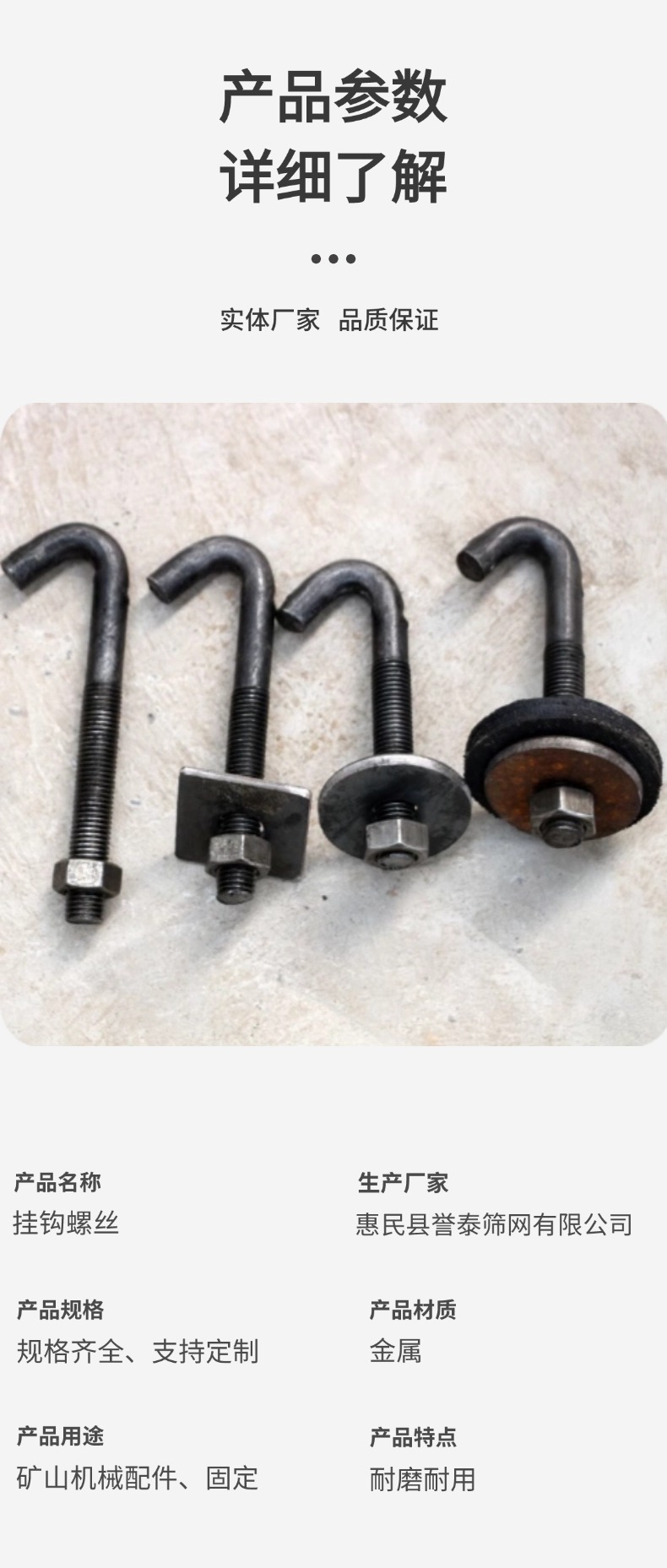 矿山筛网挂钩螺丝,是矿山筛分作业中不可或缺的紧固配件。它由金属螺杆与独特挂钩头部组成。螺杆强度高,具备良好的抗变形与抗断裂性能,可稳定旋入安装基座。挂钩设计巧妙,能紧密勾住筛网边缘,实现筛网的牢固安装。这种螺丝规格丰富,适配不同尺寸、材质的筛网。在矿山开采、矿石筛选等环节,有效防止筛网位移,保障筛分工作的稳定、高效进行 。 咨询电话: