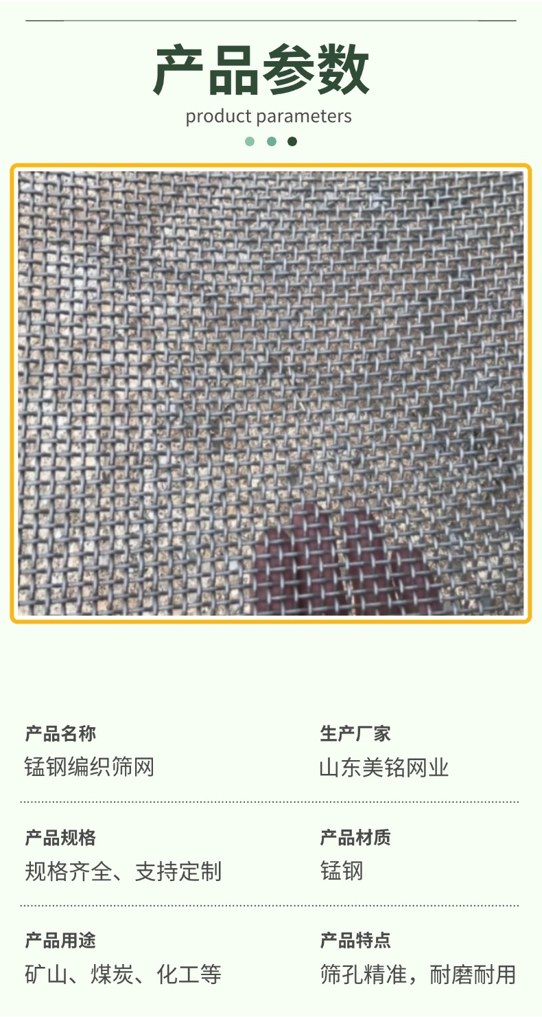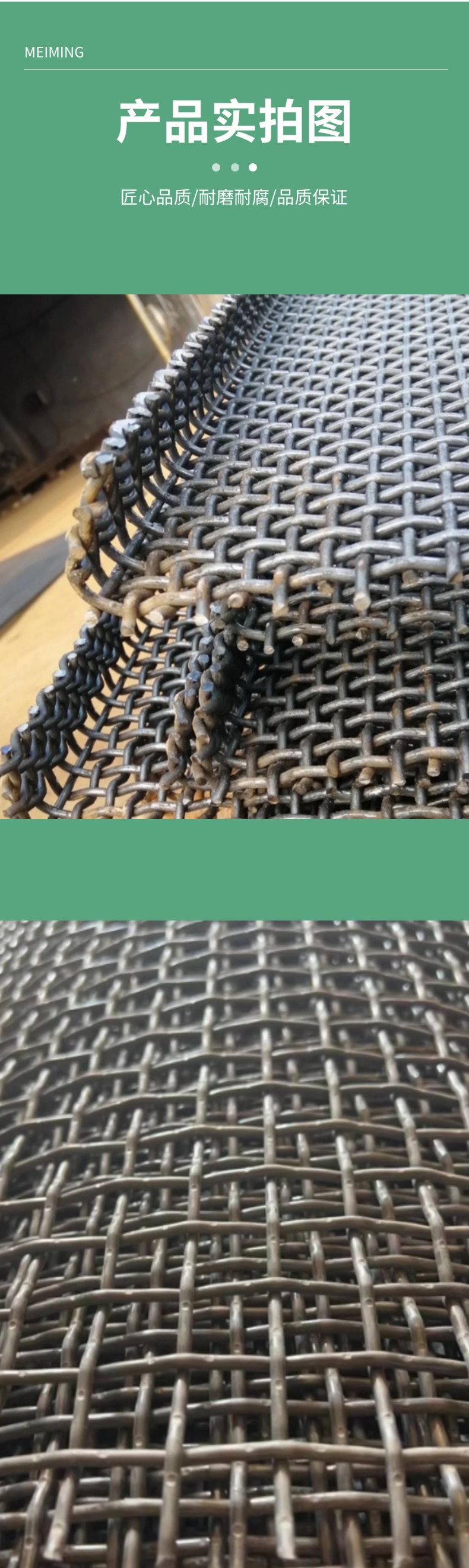 锰钢编织筛网,专为应对严苛工业环境而生。严选锰钢精心编织,网面结构紧密且均匀。其高强度与高韧性,让它无惧坚硬物料的冲击与摩擦。在矿山筛选矿石时,既能严准筛选不同粒径,又能凭借良好的柔韧性,有效减少物料卡顿,保证筛分流畅。由于编织工艺赋予的耐用特性,它使用寿命长,能承受频繁作业,为矿山、采石场等行业提供稳定可靠的筛分服务,助力生产高效运行 。