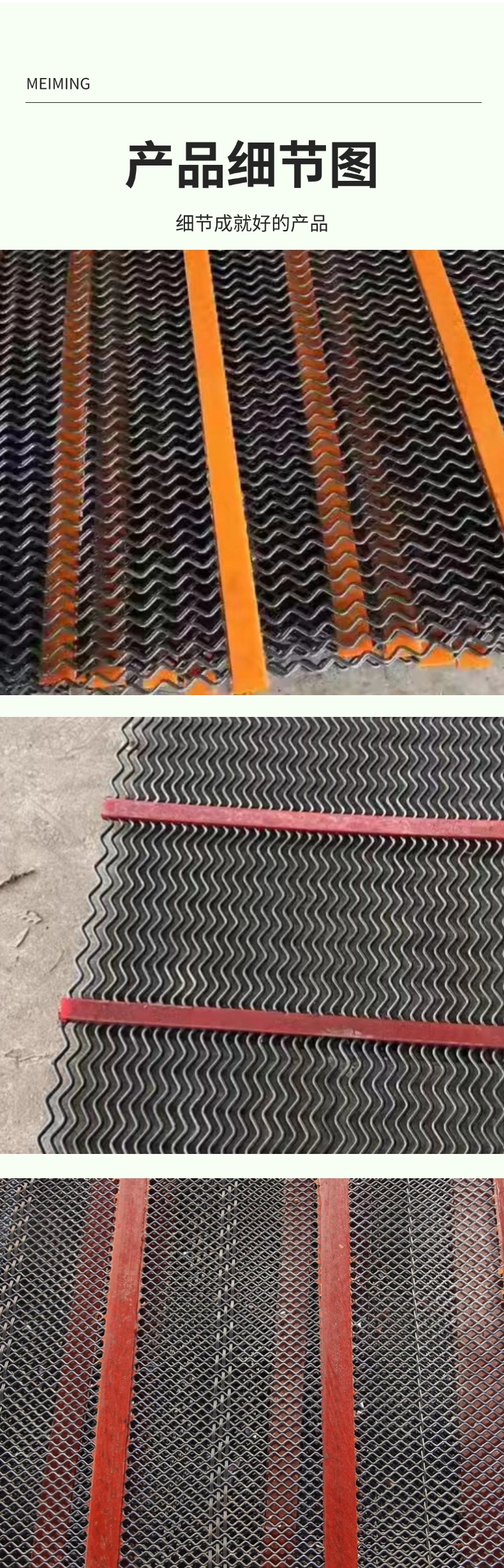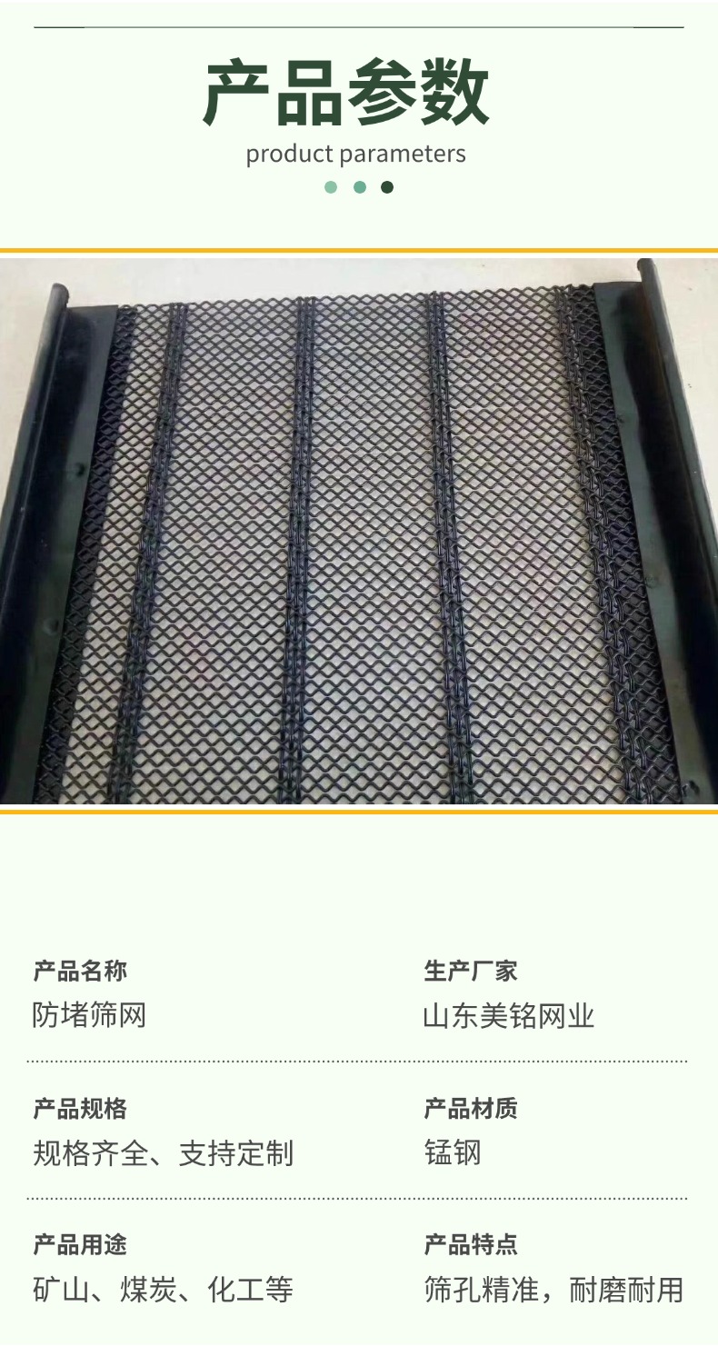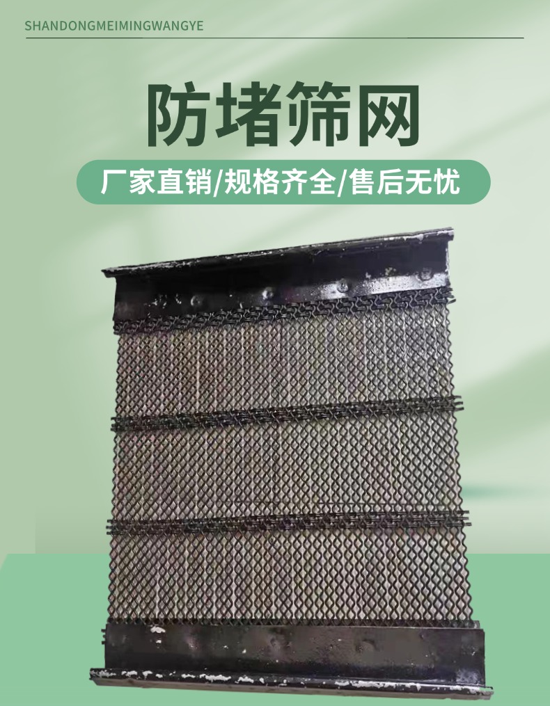 防堵筛网由锰钢编织成网面,部分配有聚氨酯加强筋结构。其网孔均匀,能准确筛分物料。锰钢材质赋予它良好的抗磨损性和强度,可适应高负荷筛分作业。聚氨酯也可有助于减少物料堵塞,增强筛网自清洁能力,适用于矿山、建筑等行业的物料筛分。