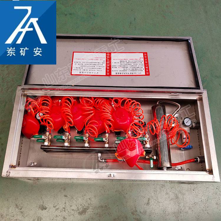 ZYJ型矿井压风(供水)自救装置,本装置一箱六组(可根据要求设计组别),能同时提供六人使用,达到互相照顾的效果。该装置由箱体、安装板、进气管、进水管、净水过滤器、门锁、呼吸器(多组)、排水装置(多组)等组成。箱体、安装板、总进气管、总进水管采用不锈钢制造而成。