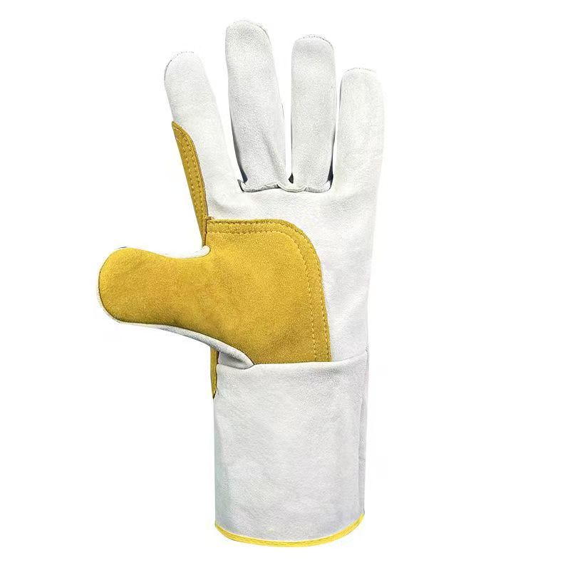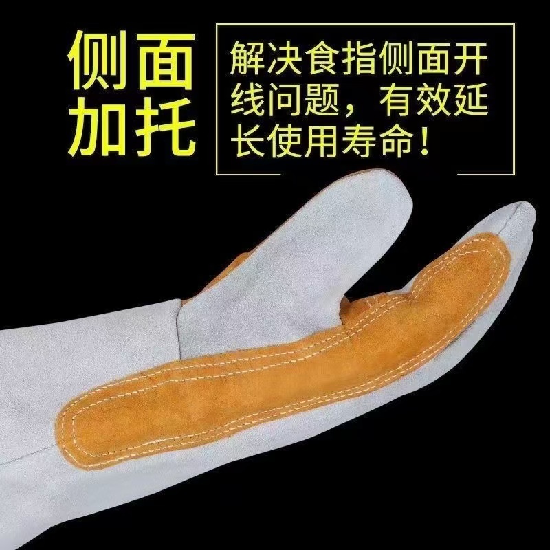 专为电焊作业打造的长款式手套,从腕部到指尖,提供全方位覆盖。手套主体采牛皮,这种材质不仅耐磨抗刮,而且柔韧性好,确保手部灵活操作。掌心特别添加加托加固设计,面对尖锐焊条、炽热焊渣,能有效分散冲击力,大大延长手套的使用寿命。