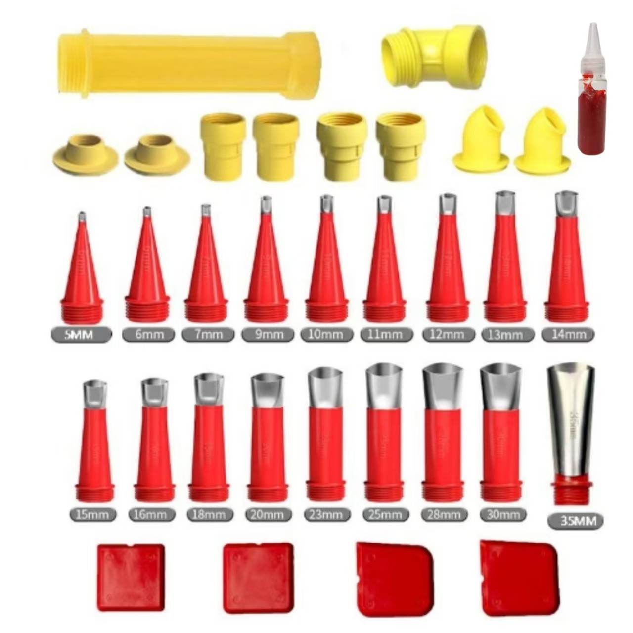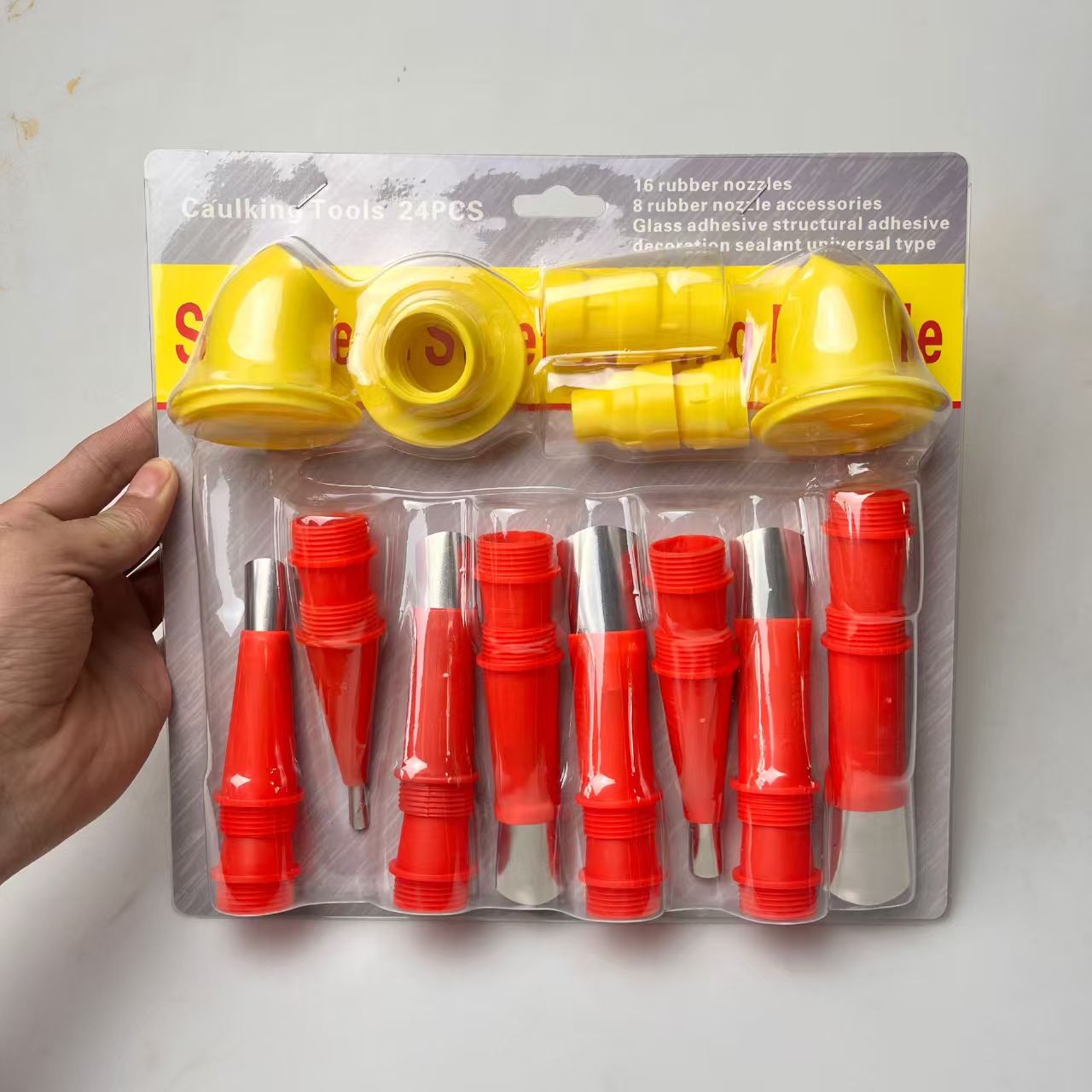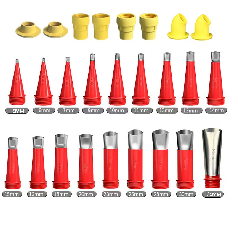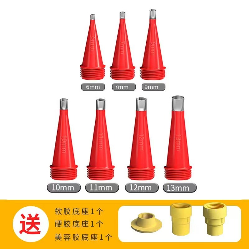 规格型号:产品有多种规格型号可供选择,常见的有不同直径尺寸的胶嘴,如5毫米、6毫米、7毫米等,还有多种组合套装,如包含多个胶嘴、不同类型底座(如软支底座、硬支底座、美容胶底座等)以及刮板、加长杆等配件的套装,可满足家装、门窗安装、外墙施工等不同场景的需求1。