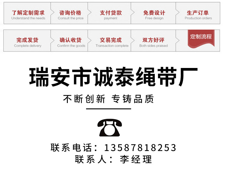 我厂生产各种绳带(涤纶绳(特多龙绳),丙纶绳(PP绳),人字带,棉绳,扭绳,牛皮纸绳,纸手挽.适用于各类手提袋提绳.束口绳和其他相关用绳。各种原料,颜色粗细均可来样定做。