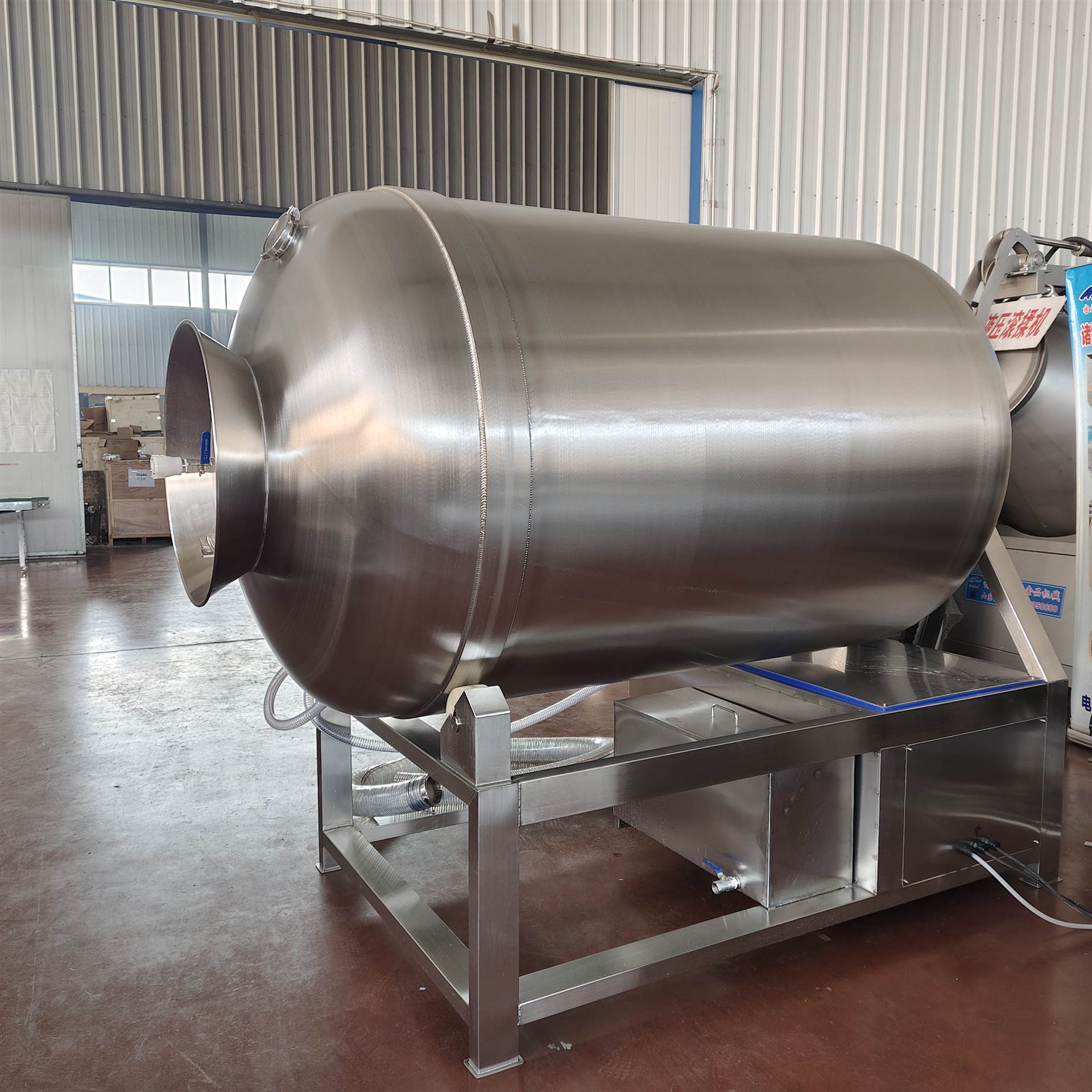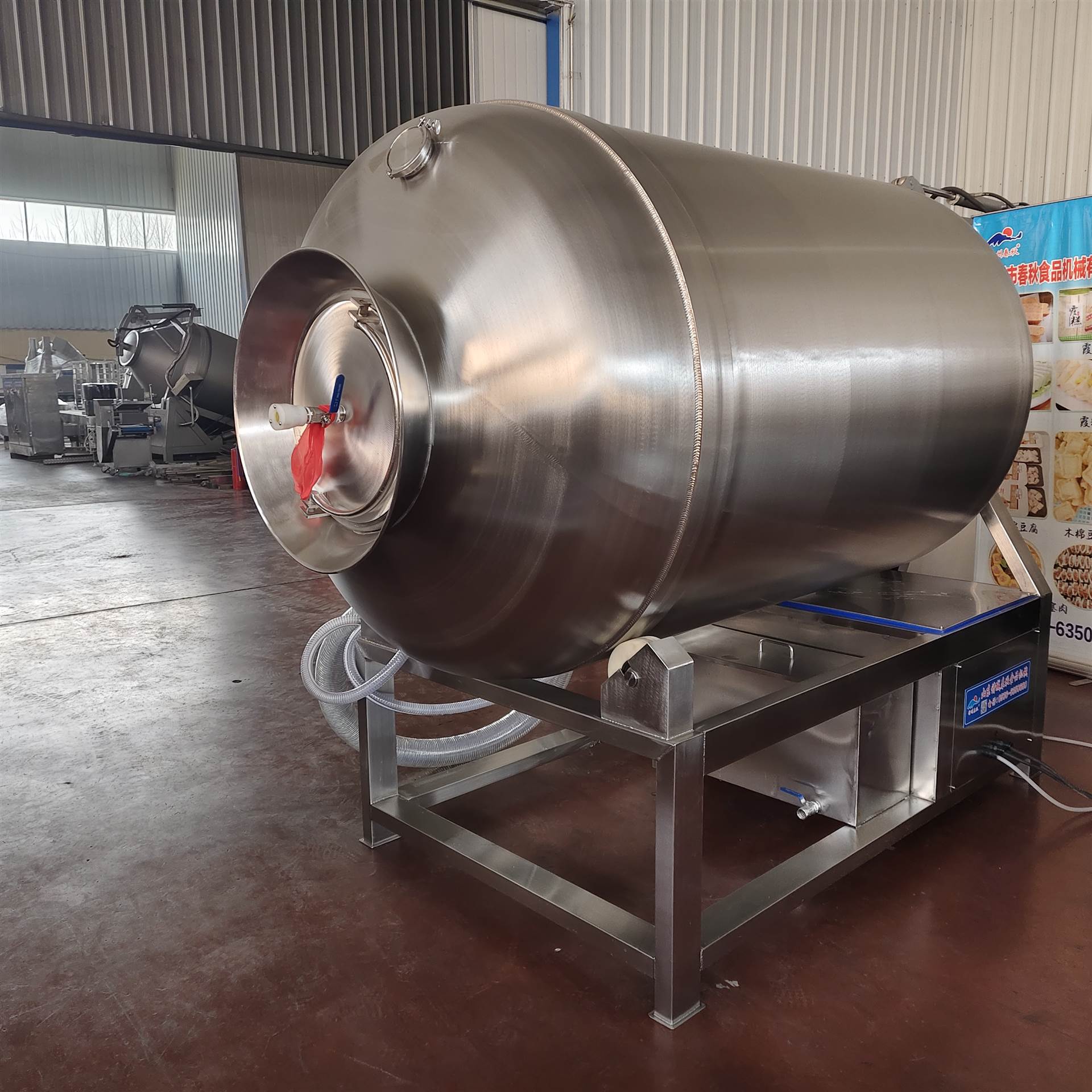 真空滚揉机是在真空状态下,利用物理冲击原理,让肉块或肉馅在滚筒内上下翻动,相互撞击、摔打,从而达到按摩、腌渍作用。腌渍液被肉充分地吸收,增强肉的结合力及弹性,提高产品的口感及断面效果;可以增强保水性,增加出品率;可以改善产品的内部结构。新一代的全自动真空滚揉机除具有真空滚揉机的特点外,还具有电脑控制与变频技术的功能。更新增加了操作系统,是机器使用更安全,更方便,更加节能高效。整机采用不锈钢制造,结构紧凑,滚筒两端均采用旋压式封帽结构,的增加滚筒内的摔打空间,使滚揉产品的效果均匀,噪音小,性能可靠,操作简便,使用效率更高。