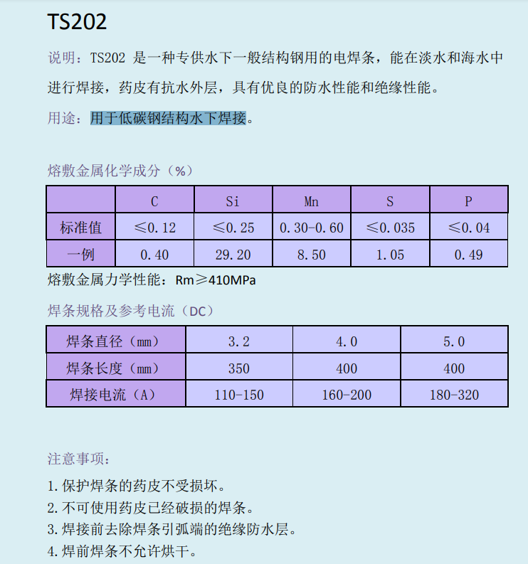 用于低碳钢结构水下焊接。 |