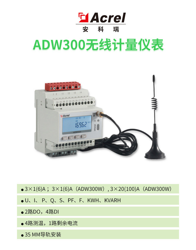 ADW300无线计量仪表主要用于计量低压网络的三相有功电能,具有RS485通讯和470MHz无线通讯功能,方便用户进行用电监测、集抄和管理。可灵活安装于配电箱内,实现对不同区域和不同负荷的分项电能计量,统计和分析。