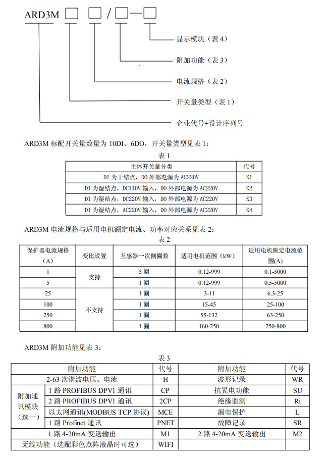 ARD3M 智能电动机保护器(以下简称保护器)适用于额定电压至 660V 的低压电动机 回路,集保护、测量、控制、通讯、运维于一体。其完善的保护功能确保电动机安全运行, 带有逻辑可编程功能,可以满足多种控制方式。可选配不同通讯模块适应现场通讯需求。