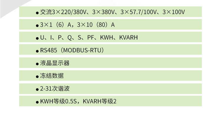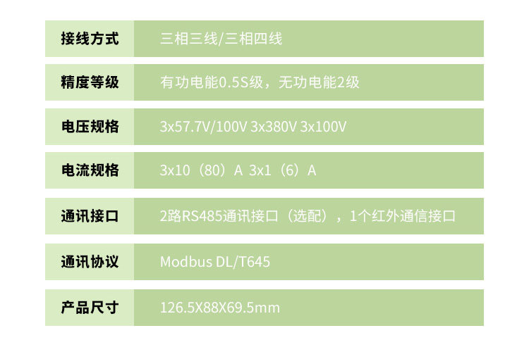 采用DIN35mm导轨式安装结构,体积小巧,能测量电能及其他电参量,可进行时钟、费率时段等参数设置,精度高、可靠性好、性能指标符合国标GB/T17215-2002、GB/T17883-1999和电力行业标准DL/T614-2007对电能表的各项技术要求,并且具有电能脉冲输出功能;可用RS485通讯接口与上位机实现数据交换。