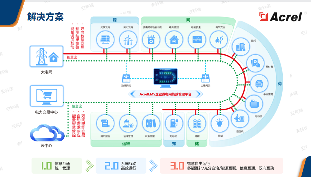 通过在源、网、荷、储、充的各个关键节点安装监测、分析、保护、治理装置, 通过高性能边缘计算网关采集数据并上传至企业微网平台。平台根据新的电网价格、 用电负荷、电网调度指令等情况,调整各系统控制策略并远程下发,使企业微电网始终高效稳定运行, 降低企业用电成本,实现能源互联、信息互动。