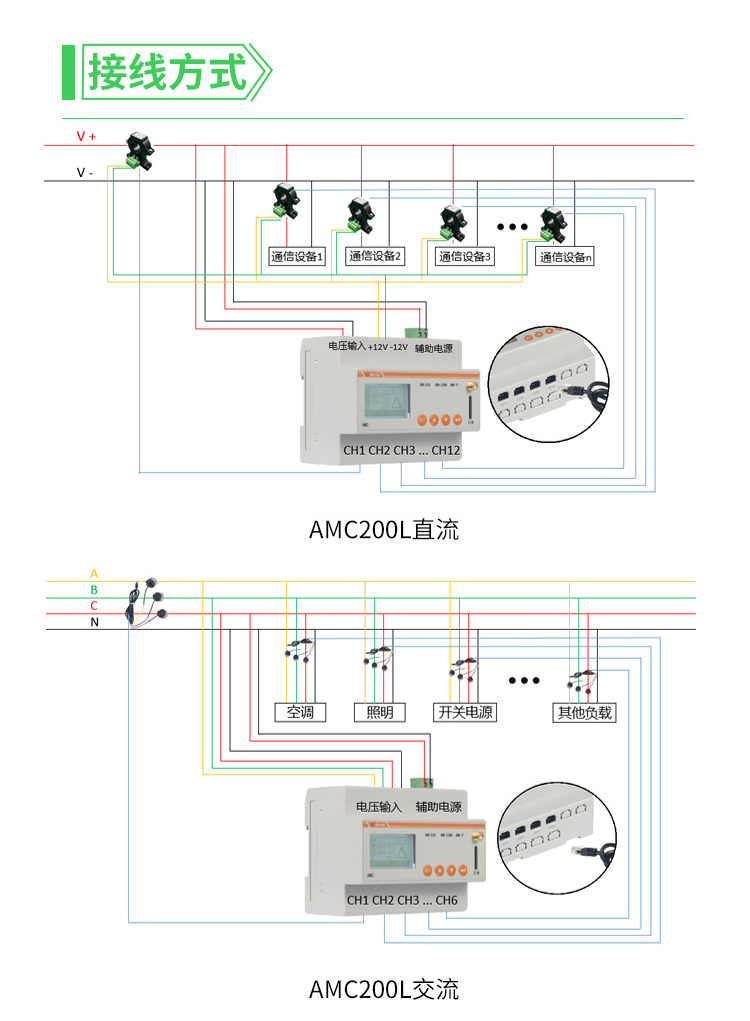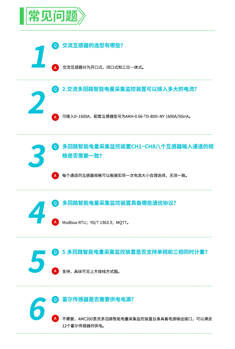 AMC300L交流多回路智能电量采集监控装置主要用于多个回路的全电参量测量,最多可同时接入6个三相回路或者18个单相回路的电流输入。可测量电压电流、功率、功率因数等参数。