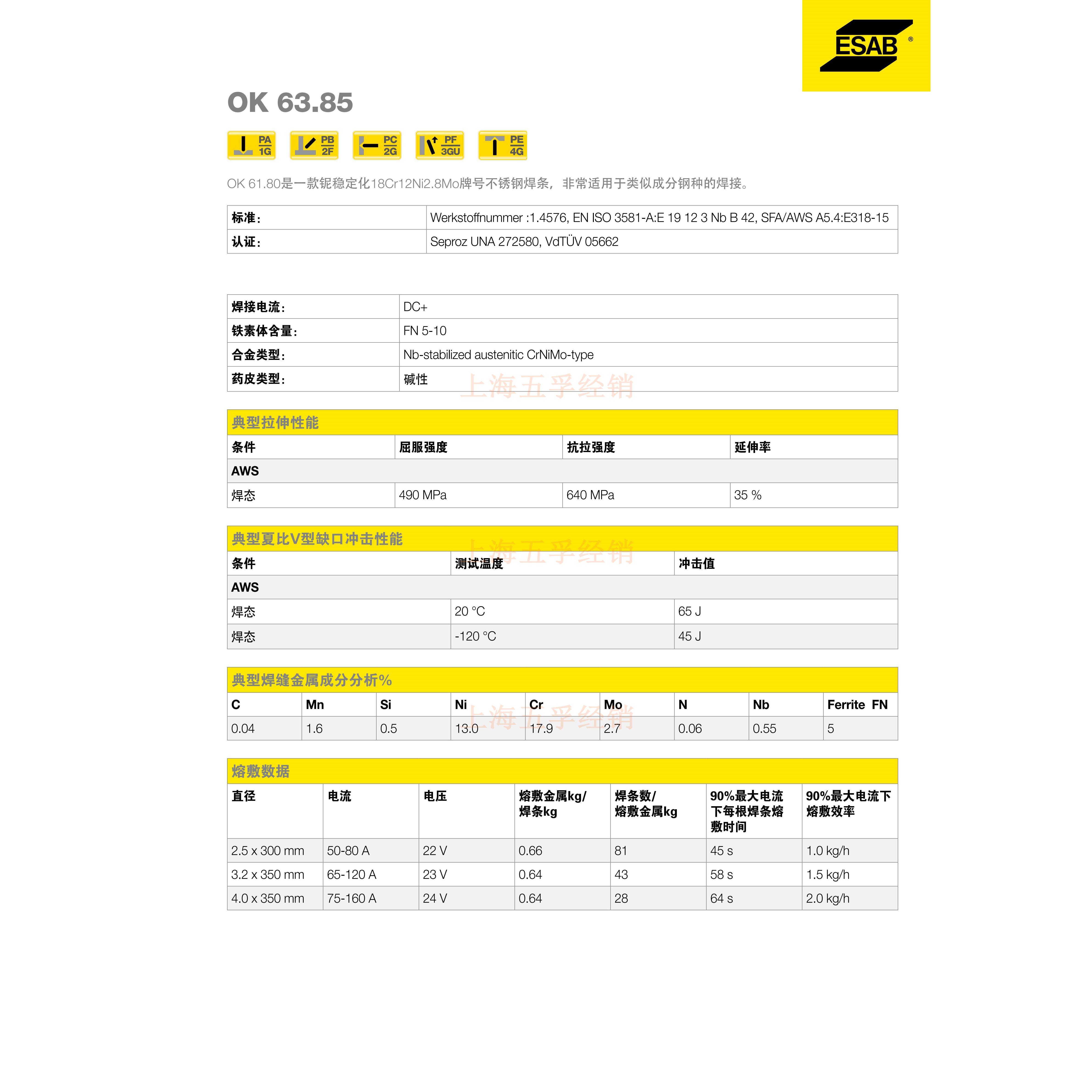OK 63.85是适用于18Cr 12Ni 3Mo型铌稳定不锈钢焊接的基础手工电焊条。