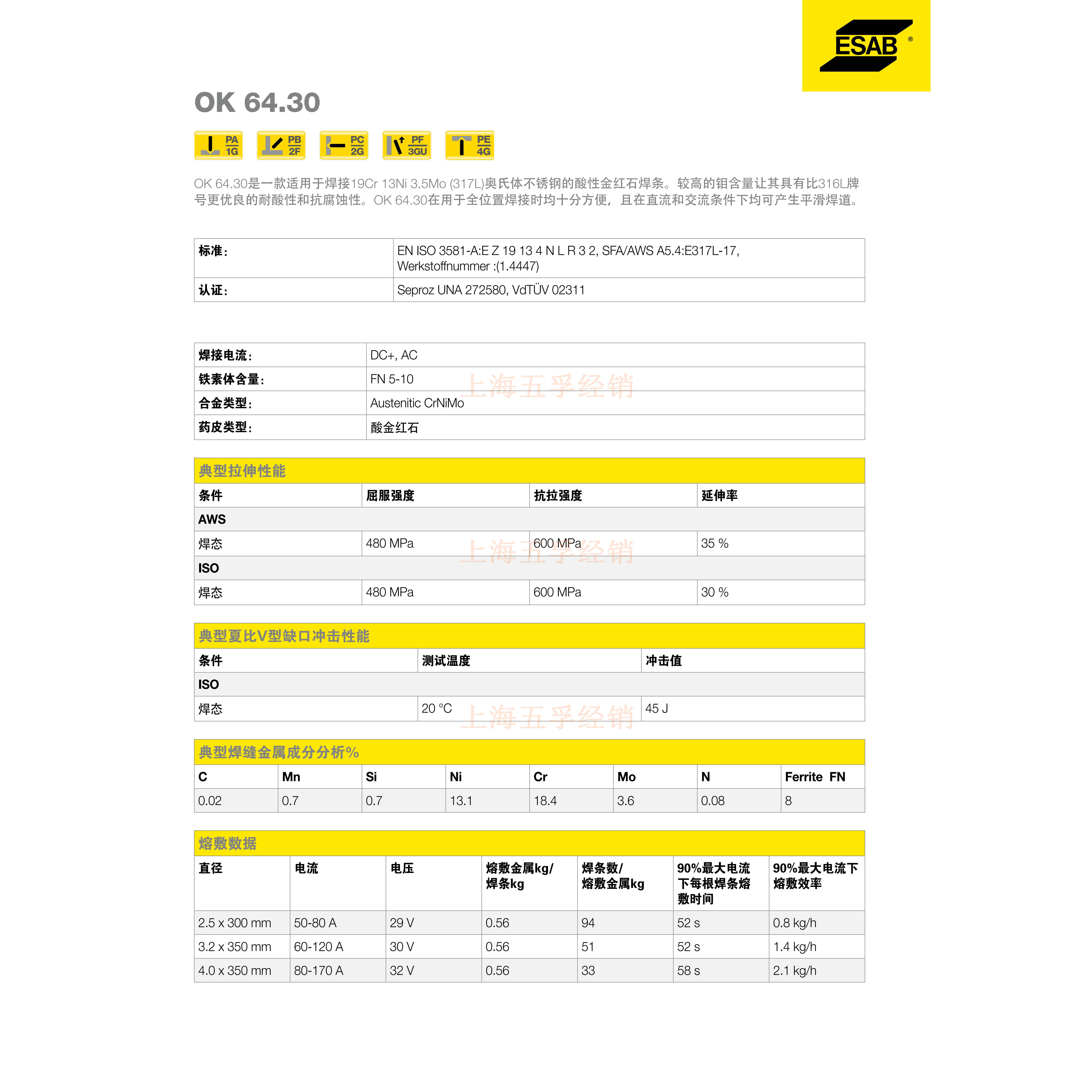 供应ESAB OK 64.30电焊条(E317L-17;EZ19134NLR32),欢迎咨询洽谈订购。