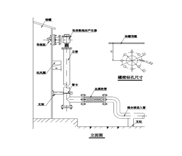 6、产生器安装在直径较小的储罐壁上连接法兰平面与储罐圆弧连处密封有困难时可直接采用将连产生器的导流罩直接焊在储罐壁上。