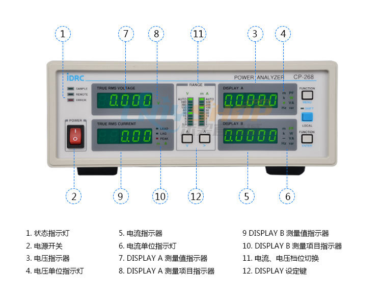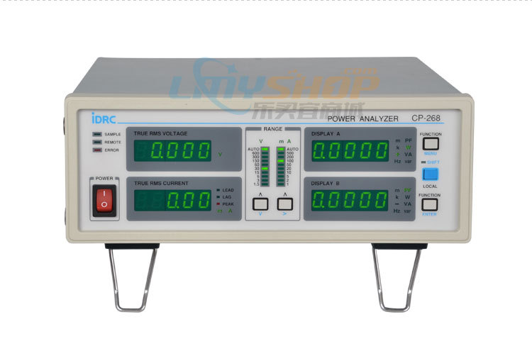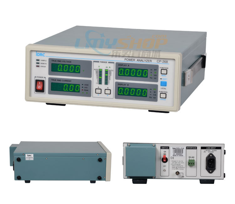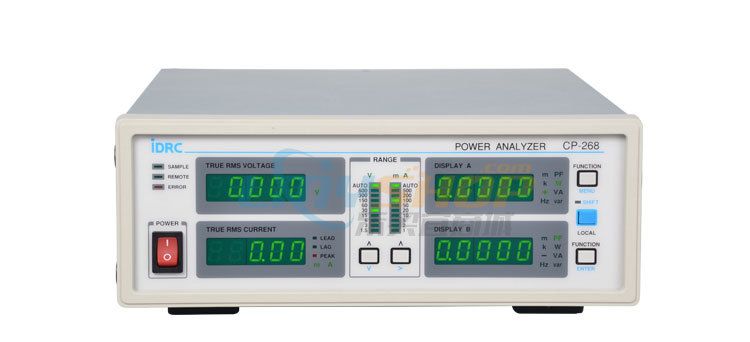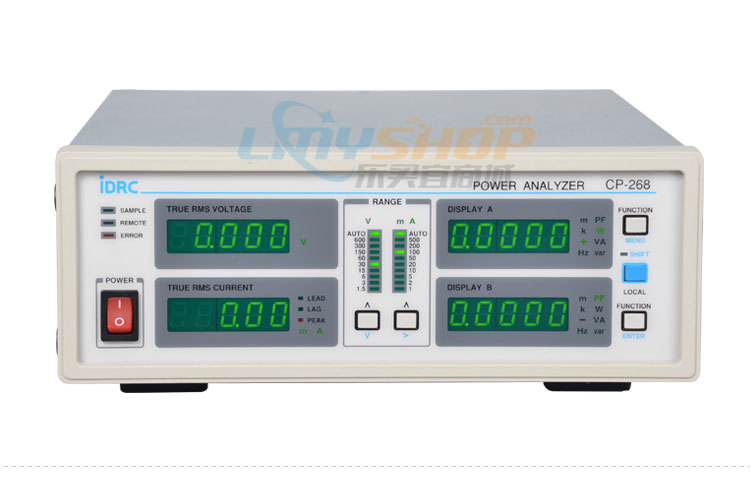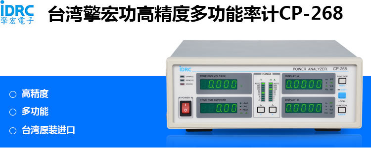 CP268-1产品特点 ●适合低于 0.3W 待机 功率量测,瓦特解析度:0.01mW at 150V / 300V Range。 ●规格超越Energy Star对于量测仪器的要求(CP-268-PS)。 ●电流 15 档,从 1mA ~ 50A (CP-268-5),均由单一端子接线,使用内部感测器量测,无需切换端子或外接其他感测器(45~65Hz)。 ●电压 9 档,从1.5V、3V、6V ~ 600V,采1.5、3、6为基准,10倍及100倍换档,档位密度高,量测精度佳。 ●电流量测采1、2、5为基准,10倍到10000倍换档,为业界最高换档密度,每个量测值均为较高精确度。 ●功率 135 档,从最小功率1.5mW到30kW(CP-268-5),均可量测,瓦特频宽符合EPA能源之星要求。 ●电压、电流量测均为真有效值(True RMS),并具手动/自动换档功能。 ●具双方向功率量测功能,并可分别显示。 ●电流超前、电流落后及峰值电流Over Range指示功能。 ●频率量测5位数解析度,最高频率解析度0.001Hz。 ●PF=0.1 时精确度依然可靠,适用于小功率负载。 ●全数位化机型,基本精度0.2%。 ●Close Case Calibration,全机无调整,全软体校正,稳定性高,校正间隔长。 ●八种量测参数:电压、电流、瓦特、负瓦特(CP-268-5 only)、功率因素、视在功率、乏功率、频率。 ●四组视窗,同时显示4种测试值,各功能更新率5次/秒。 ●数字LED及单位LED亮度分开调整;按键音可开启/关闭。 ●关机前的设定可记忆( Last Panel Set)。 ●RS-485为标准配备,连线速率可达115K bps; ●GPIB介面选购,GPIB介面指令 SCPI compatible ●全系列具CE认证。 CP268-1适用场所: ●LCD监视器等显示设备、绿色电脑、交换式电源供应器( S.P.S )、AC ADAPTER ( For数位相机、DV、NB、 PDA、手机、Wireless AP、HUB、LCD Monitor、DVR、外接式储存设备...)、事务机器(印表机、扫瞄器、 影印机、传真机)。 ●太阳能电源、电池、家电(变频冷气、空调、冰箱、洗衣机、视听设备、音响产品、电视机、背投电视、 PDP电视、LCD、DLP、LCOS投影机、VCD、DVD、蓝光播放器、家庭游戏机(PS3、Wii、XBOX)等 视讯设备、微波炉、烤箱等....)、照明设备灯具、电子安定器、省电灯泡、环保监视器。 ●不断电系统( UPS )、变流器、电焊机、发电机、电动工具、交直流马达、电动汽机车、电动助力车、 电动自行车、运动器材、马达测试(旋转电机)、燃料电池电源、教育单位(电力电子系、电机系...)。