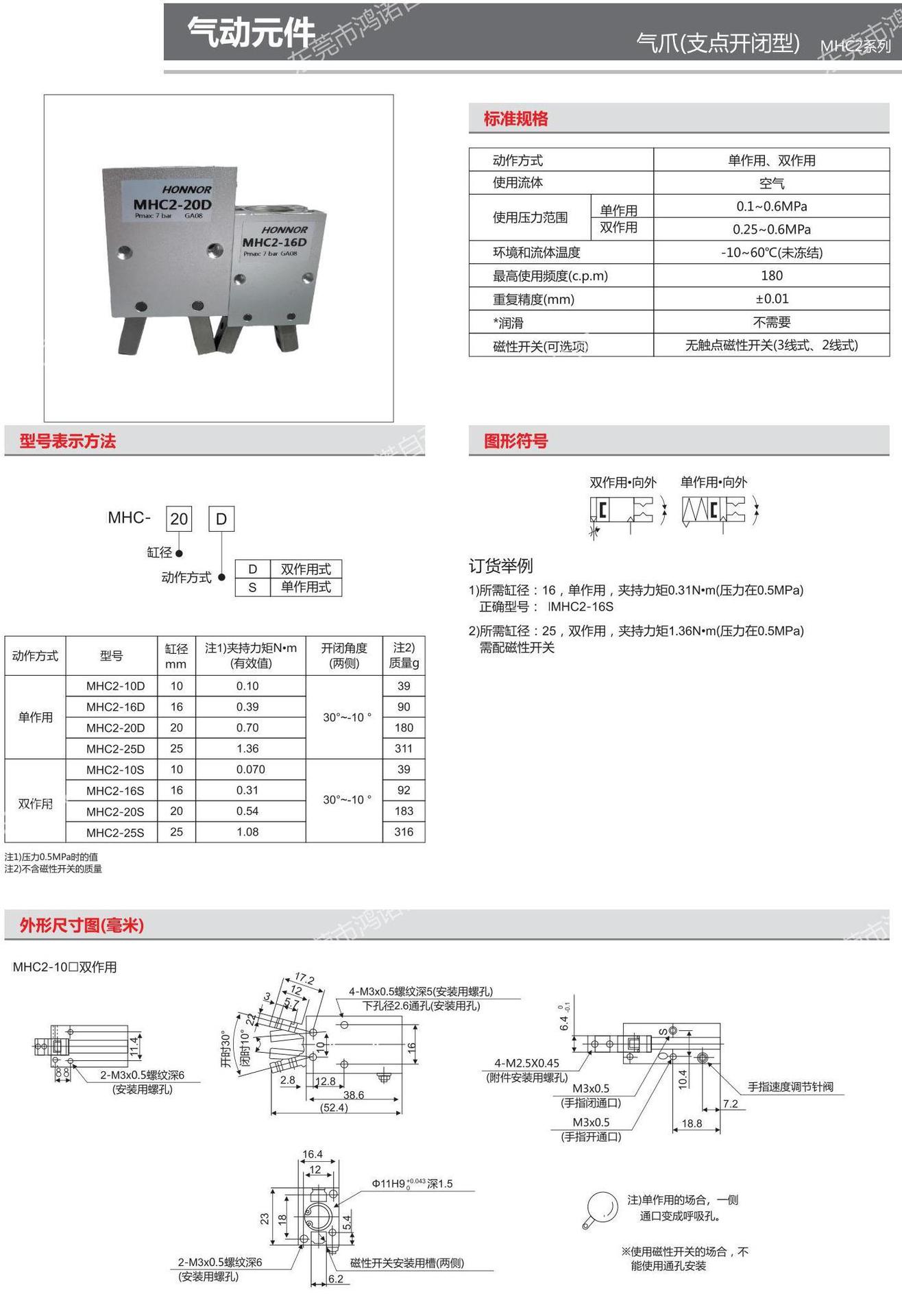 HONNOR鸿诺小型机械手配件气爪气动手指气缸MHC2-10D 16D 20D 25D