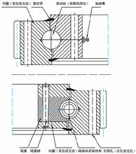 由左及右分别是(上部分):1.外圈(有齿或无齿)2.密封带 3.滚动体(滚球或滚柱) 4.加油嘴由左及右分别是(下部分):1.堵塞 2.堵塞销 3.内圈(有齿或无齿) 4.隔离块或保持架 5.安装孔(丝孔或光孔)应用编辑回转支承在现实工业中应用很广泛,被人们称为:“机器的关节”,其主要应用在被广泛应用于:汽车起重机、铁路起重机、港口起重机、船用起重机、冶金起重机、集装箱起重机、挖掘机、灌装机、以及CT机驻波治疗仪、航海仪、雷达天线座、发射架、、机器人以及旋转餐厅等等方面。工程机械回转支承应用广泛,工程机械是回转支承初应用也是应用广泛的地方,如土方机械、挖掘机、解体机、堆取料机、平地机、压路机、强夯机、凿岩机械、掘进机等。其他的还有:混凝土机械:混凝土泵车、混凝土搅拌布料杆一体机、带式布料机给料机械:圆盘式给料机、混砂机起重机械:轮式起重机、履带式起重机、门座式起重机、塔式起重机、叉式起重机、随吊机、龙门起重机 地基处理机械:冲击式反循环钻机、回转式钻机、冲击式回转式钻机、旋挖钻机、反循环回转钻机、正循环回转钻机、长螺旋工程钻机、潜水工程钻机、静压桩机、打桩机工程船舶:挖泥船专用车:桥梁检测车、消防车、擦窗机、平板运梁车、高空作业车、自行式高空作业平台轻工机械:饮料机械、吹瓶机、包装机械、灌装机、回转理瓶机、注塑机船用起重机