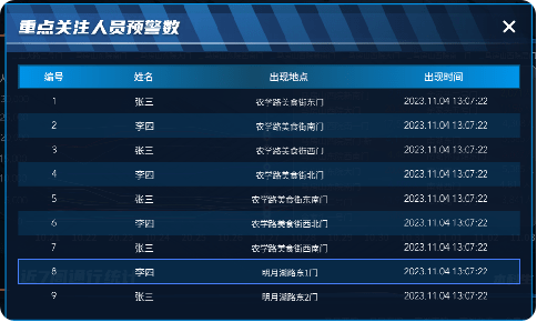 8. 重点人员关注:通过后台设置重点人员黑名单信息,监控系统发现重点人员,可时间显示在可视化系统中,为学校提供实时的安全保障。