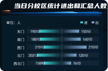 5. 分时段各校门通行统计:通过可视化图表实时直观显示各个校门内每日进出人员数,可提供学生、教职工等各类分项数据展示,为保卫日常管理提供数据保障。