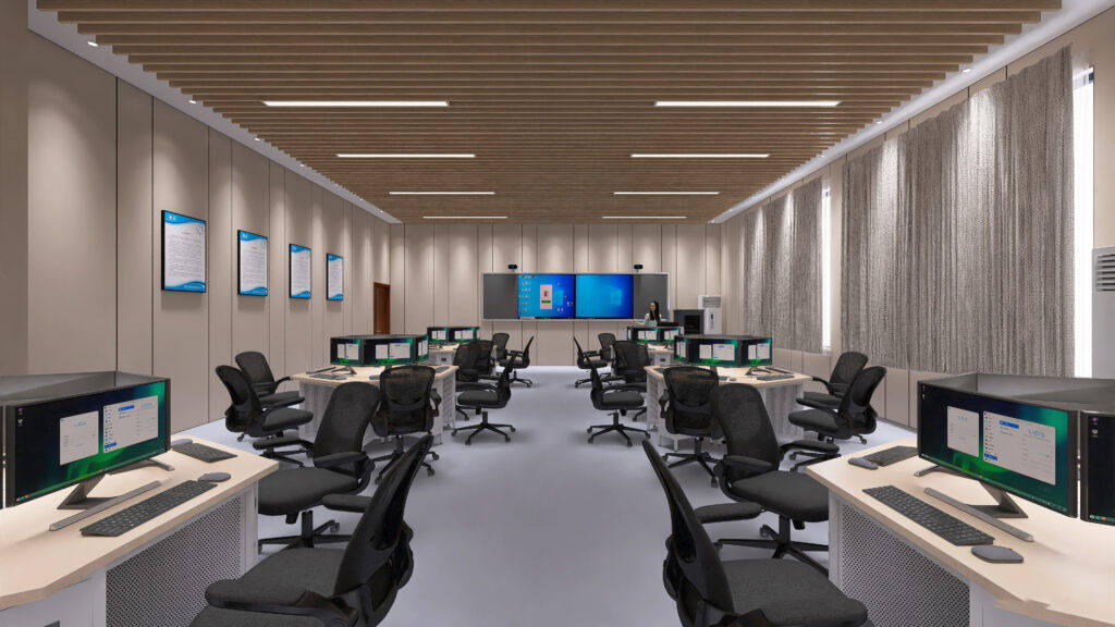 信创实训实践环境采用集中算力模式,可通过私有云或公有云的方式管理算力资源。这种模式实现了算力资源的统一管理,自动按需分配,具备高安全性和鲁棒性。信创实训实践环境旨在满足各种类型教学活动的需求,为实训室提供可靠的计算支持。实训室采用信创终端PC机组成局域网,为学生提供进行信创实验的硬件支持。这些终端PC机专为信创实训室设计,保障实训室内的网络畅通,为学生提供稳定而高效的实训环境。终端机房是学生进行实际操作和实训的关键场所,确保他们能够充分掌握信创技术应用的实际操作能力。