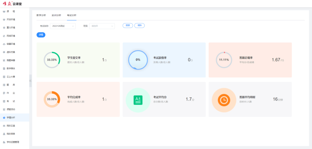 以数据分析为支撑的多教学场景管理: 教学软件需满足虚实结合的特点,包括课堂演示、学生实践、课堂考核、综合考试等与实际教学相符的场景。这些行为数据可即时记录并反馈给学生和教师,实现对教学过程的即时监控、优化和改进。