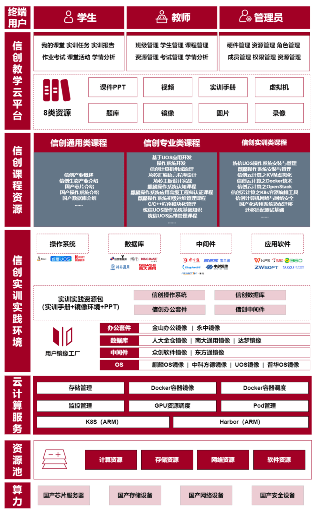 系统采用基于ARM架构(非X86结构)的K8S容器集群管理平台技术,将理论知识、实训教学和信创项目实践融合,由浅入深、循序渐进,逐步提升学生的技能和项目实践能力,使得学生与企业人才需求无缝衔接,达成学校人才培养定位目标。