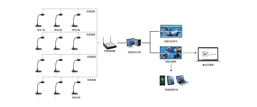 由N路教学互动宝、大屏和学生实训系统组成,不同表现形式一样;