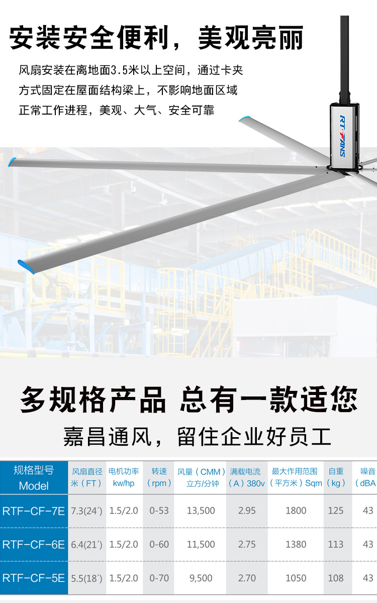 广东嘉昌通风降温科技有限公司,座落于世界制造名城,粤港澳大湾区——东莞,公司从事通风降温换气行业近二十载,专注帮客户如何解决闷热车间、公共场所等,为客户提供节能、环保、安全、高效的产品及解决方案;公司集产品研发、生产、销售、设计、工程、服务于一体,拥有自主品牌“瑞泰风”工业大风扇、环保空调,“嘉悦风”移动蒸发式冷气机、玻璃钢负压风机、镀锌板负压风机、离心风柜等多款通风降温换气产品,生产基地近万平方;产品广泛适用于各类型工厂生产车间、物流仓储中心、健身会所、商场、汽车4S店、车站候车室、农贸市场、水果水产批发市场及户外活动等场所,产品拥有多款专利及通过CQC、ISO9001D等权威与欧洲CE安全认证和检测。