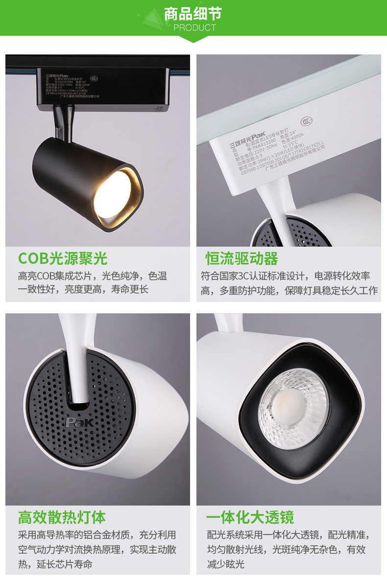 1、的COB光源,光色纯净,光效高达120LM/W,高效节能。