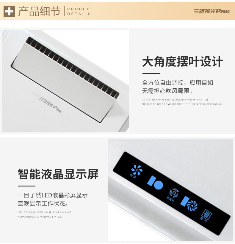 5、智能摆风,60度摆叶送风,基于力学原理设计60度摆叶送风,风量更大,噪音更小,降温更强劲;