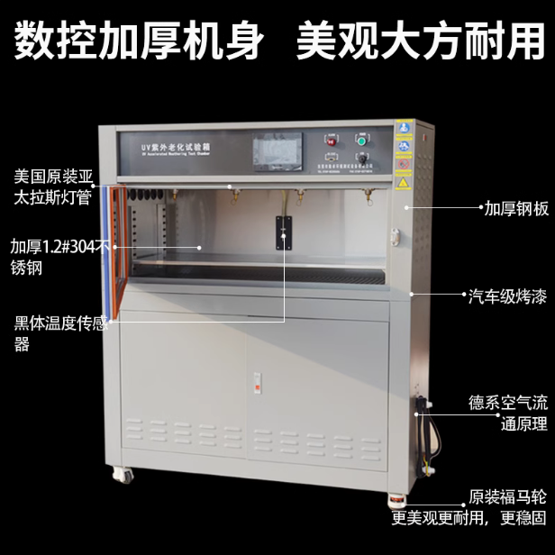 紫外线照射通过UV灯管发射紫外线,模拟太阳光中的紫外线辐射;温度调节通过加热元件和制冷系统调节箱内温度,模拟不同环境温度;湿度调节通过加湿器和除湿器调节箱内湿度,模拟不同湿度条件;样品暴露将样品放置在测试箱内,接受紫外线照射和温湿度调节,进行老化测试。
