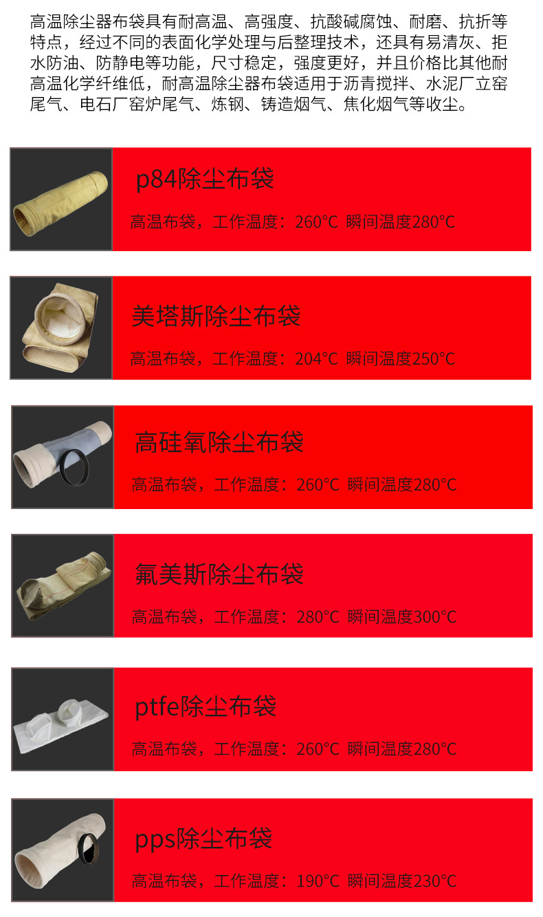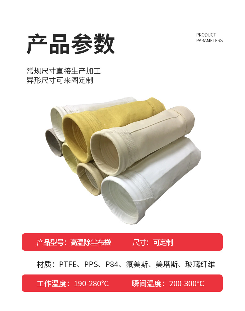 商品属性订货号GWBD加工定制是货号GWBD产品别名除尘滤袋材质氟美斯、玻纤、PTFE、美塔斯、pps、p84产品用途布袋除尘器过滤粉尘适用范围布袋除尘器品牌宁杰环保型号氟美斯、玻纤、PTFE、美塔斯、pps、p84规格氟美斯130*2450mm,氟美斯130*6000mm,氟美斯160*2450mm,氟美斯160*6000mm,PTFE130*2450mm,PTFE130*6000mm,PTFE160*2450mm,PTFE160*6000mm,玻纤130*2450mm,玻纤160*6000mm,美塔斯130*2450mm,美塔斯160*6000mm,pps130*2450mm,pps160*6000mm,p84130*2450mm,p84160*6000mm,亚克力130*2450mm是否跨境出口货源否商品描述