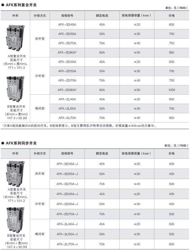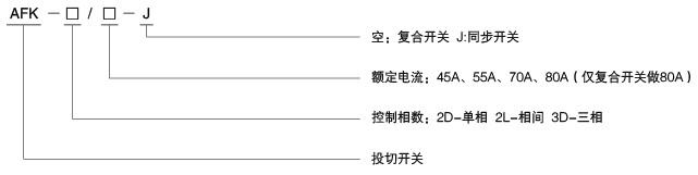 注:B 型开关与 A 型开关只是尺寸不同,B型尺寸额定电流 70A,其他电性能A型、B型均一致,选型需标明尺寸,不标注则默认 A 型尺寸。