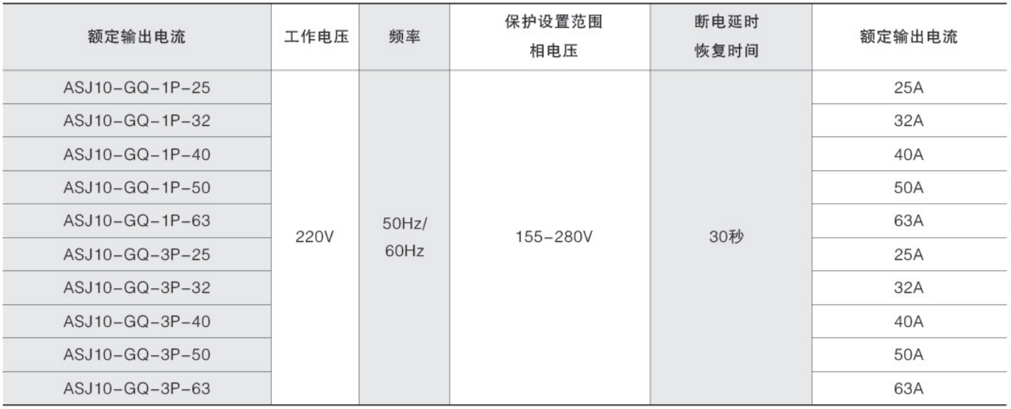 ASJ10-GQ系列自复式过欠压保护器(以下简称ASJ),适用于单相交流电压230V或三相电压400V,频率50Hz,额定工作电流至63A及以下的用户或负载。由中性线故障引起的单相或三相线路过、欠电压时,保护器对用电设备进行保护。