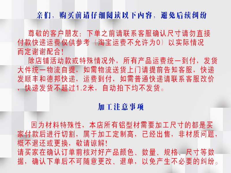 注:铝材发货可以整条发货或者对半切开3米,需要具体尺寸切割和定制其他颜色联系客服代表