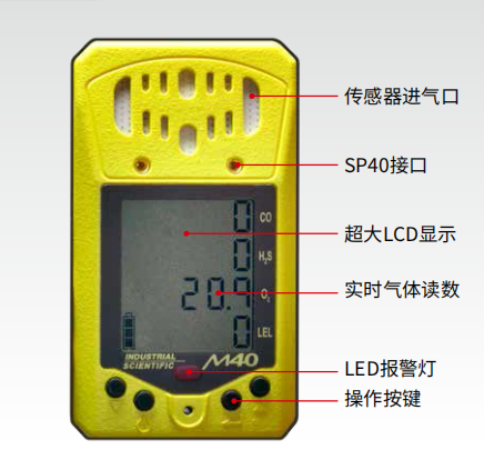 传感器规格气体测量范围分辨率H2S0-200 ppm1 ppmCO0-1000 ppm1 ppmO20-30.0%0.1%可燃气体0-100% LEL0-5.0% v/v1%0.1%用户可调节所有传感器的报警设定点。仪器启动过程中,设定点将自动显示。