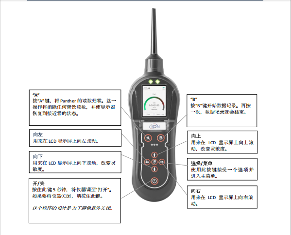 Panther 和 Panther PRO 都具备易于使用的图形界面和直观的小键盘,实现简单的功能选择和调整。Panther 采用彩色 LCD 显示屏、LED 指示灯和声音提示器,可以显示检测到的信号。使用 Panther 的常见应用场景:?质量保证--在产品生产后测试密封完整性?实验室应用--检测质谱仪和色谱仪设备的泄漏情况?工业--气瓶、管道工程和工艺设备的渗漏?医疗 - 测试膜材料和手套箱的密封性?气动 - 阀门密封测试Panther 根据 5 E-4 cc/s 的氦气泄漏量进行校准,以便进行容积式读数,并使用 5000ppm 的氦气进行校准,以便进行浓度测量。可选择单位:cc/sec立方厘米/秒读数表示从一个点逃逸到大气中的气体体积,即从一个充满气体的容器或管道上的一个洞中泄漏。ppm每百万份是浓度读数。Panther 会显示正检测的气体的浓度,但衡量泄漏量较为困难。mg/m3毫克每米立方也是衡量浓度的单位。(见 ppm)g/yr克每年是衡量泄漏率的另一种方法。%Vol这一单位衡量环境中目标气体的比例。