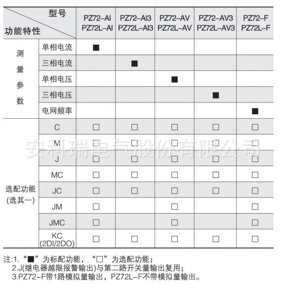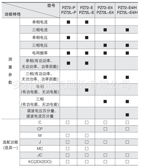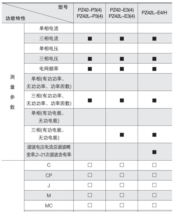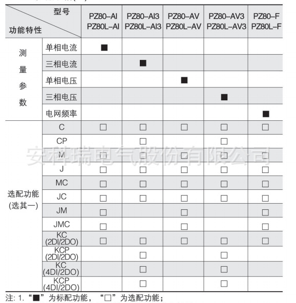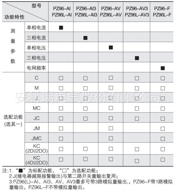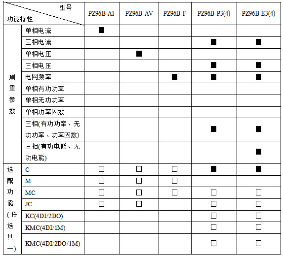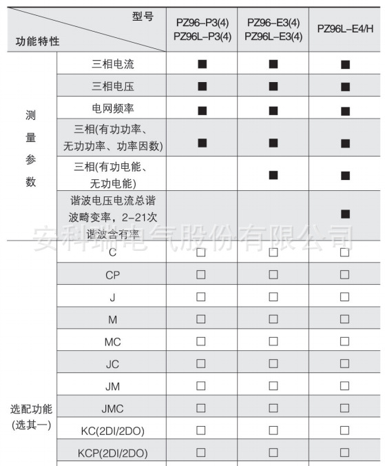 2、PZ96(L)-E3(4)在选配KC(4DI)功能时具备1路有功电能脉冲信号输出端口,在选配KC(2DI/2DO、4DI/2DO)功能时无脉冲信号输出端口;