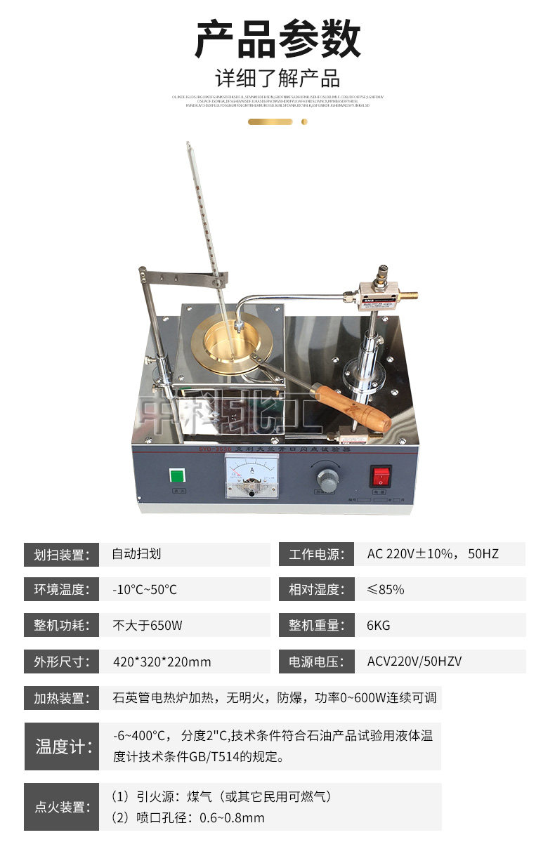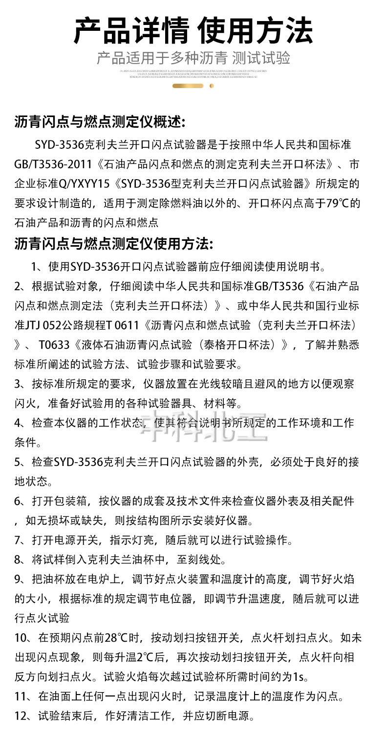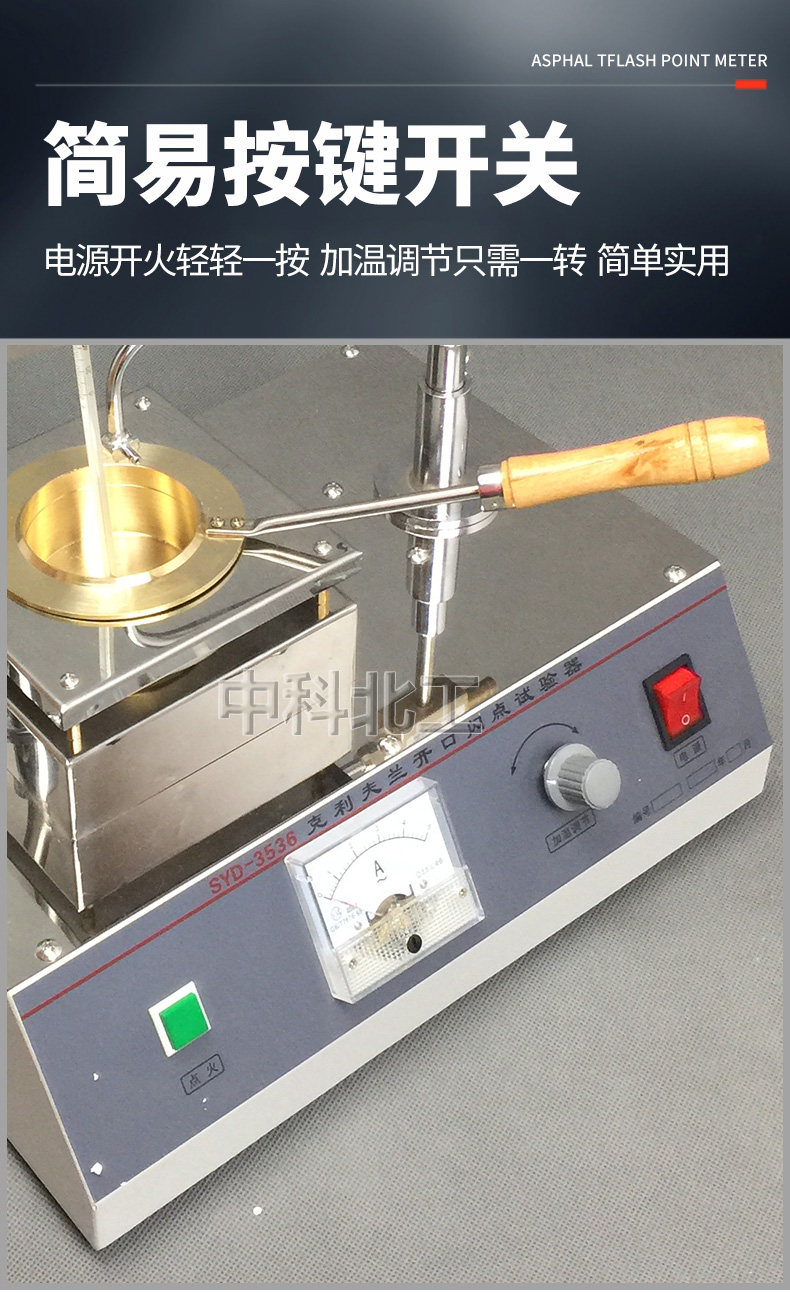 产品适用于多种沥青 测试试验。 SYD-3536克利夫兰开口闪点试验器是于按照中国人民共和国标准GB/T3536-2011《石油产品闪点和燃点的测定克利夫兰开口杯法》、市企业标准Q/YXYY15《SYD-3536型克利夫兰开口闪点试验器》所规定的要求设计制造的,适用于测定除燃料油以外的、开口杯闪点高于79°C的石油产品和沥青的闪点和燃点。