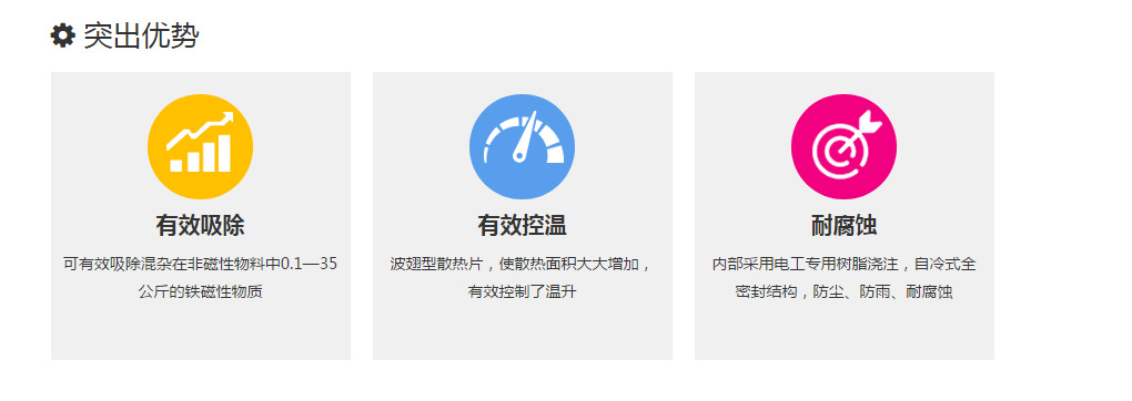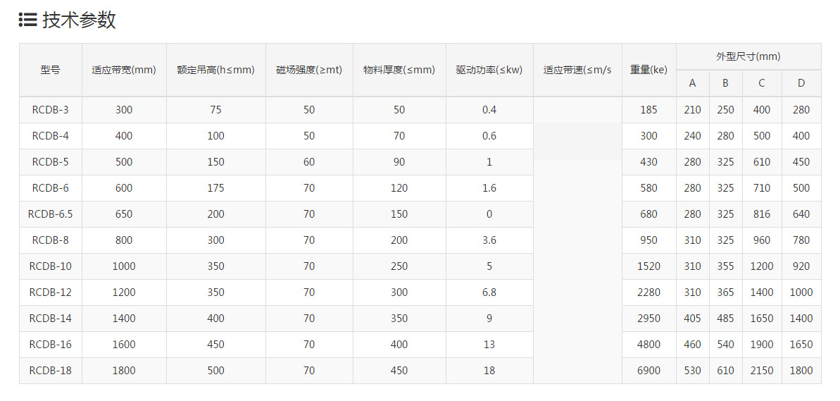 RCDB系列干式电磁除铁器(亦称PDC系列盘式、RCDY系列)是一种用于清除粉状或块状非磁性物料中杂铁的除铁装置。其内部采用电工专用树脂浇注,自冷式全密封结构。具有透磁深度大、吸力强、防尘、防雨、耐腐蚀等特点,在极其恶劣的环境中仍能可靠运行。