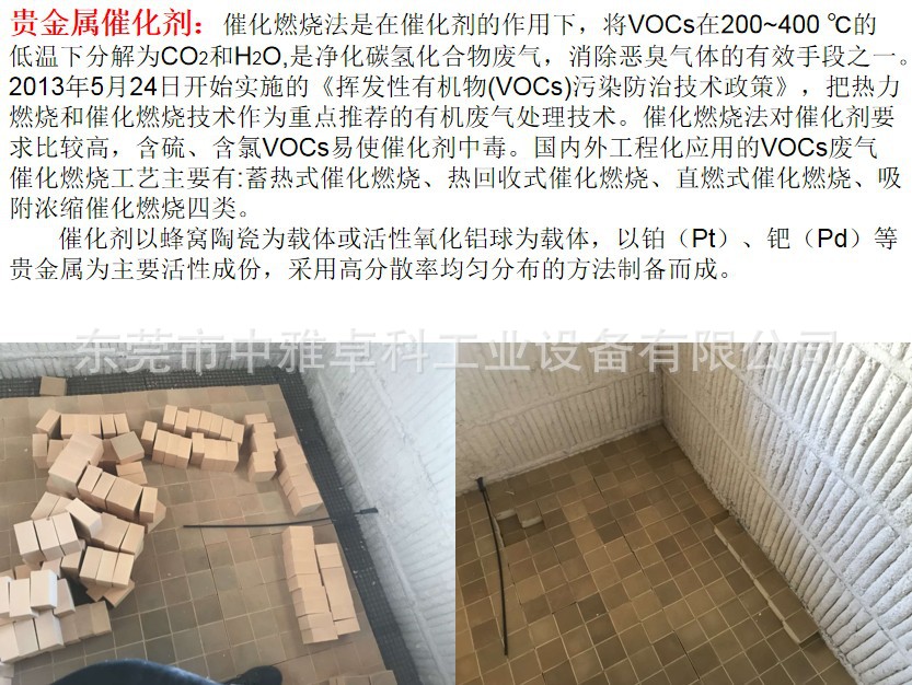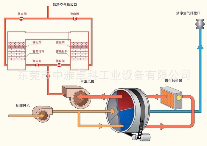 脱附所用的风量仅为1/10-1/20的来源废气的风量,因此每单位体积所含的VOCs浓度将会提升,脱附后的废气将会经由风机的抽取来到蓄热室将浓缩后的废气温度提升到催化剂所需的入口温度,以便能够达到充分分解的目的,假如在蓄热室换热后无法达到所需的温度,热交换器之后的燃烧器将会对废气进行加热以达到要求,同时该燃烧器也扮演着整个废气焚烧装置起机时热量供给的来源。