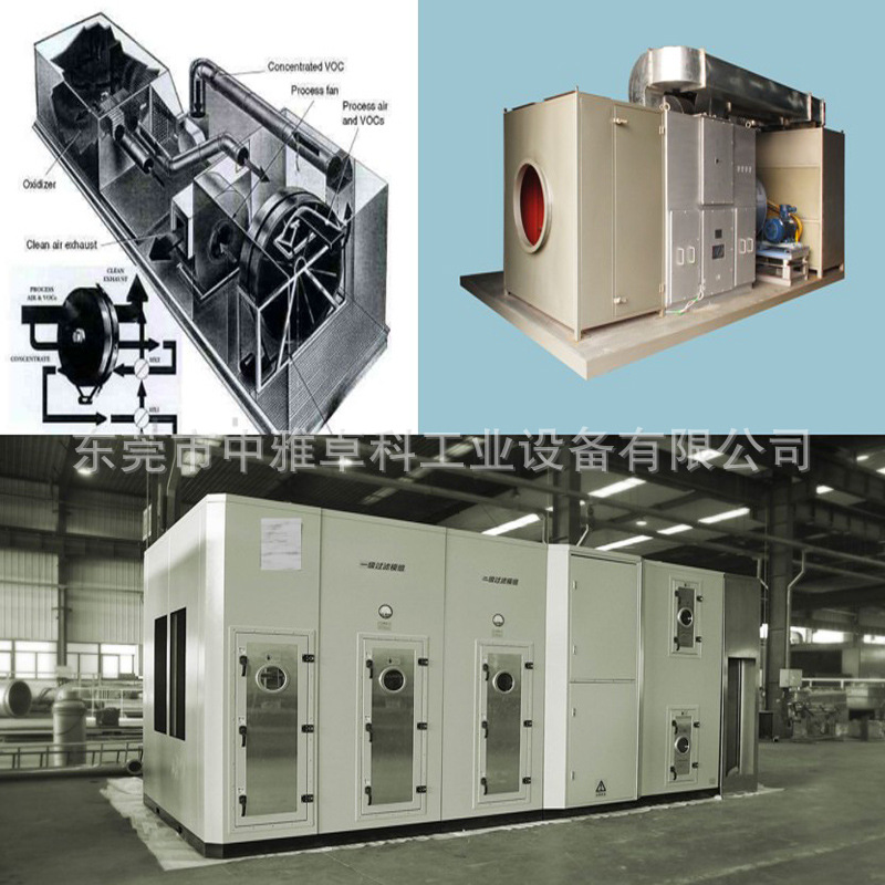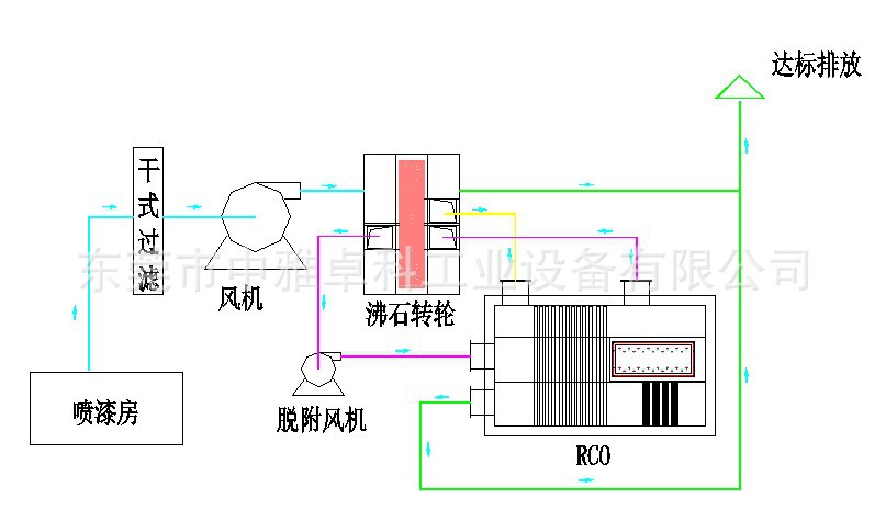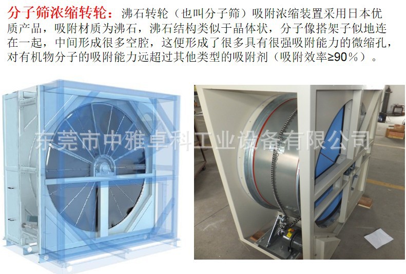 接着有机废气进行沸石转轮进行VOCs的浓缩,转轮分为三个区域:吸附区、脱附区以及冷却区,进入吸附区时VOCs分子将被吸附在沸石表面,净化后达到排放标准的有机废气排放到大气。由于沸石具有低温吸附高温脱附的特性,1/10-1/20的进气气流完成的沸石表面刚完成脱附部分沸石降温后加热到180~210℃后,导回到转轮脱附区进行脱附。