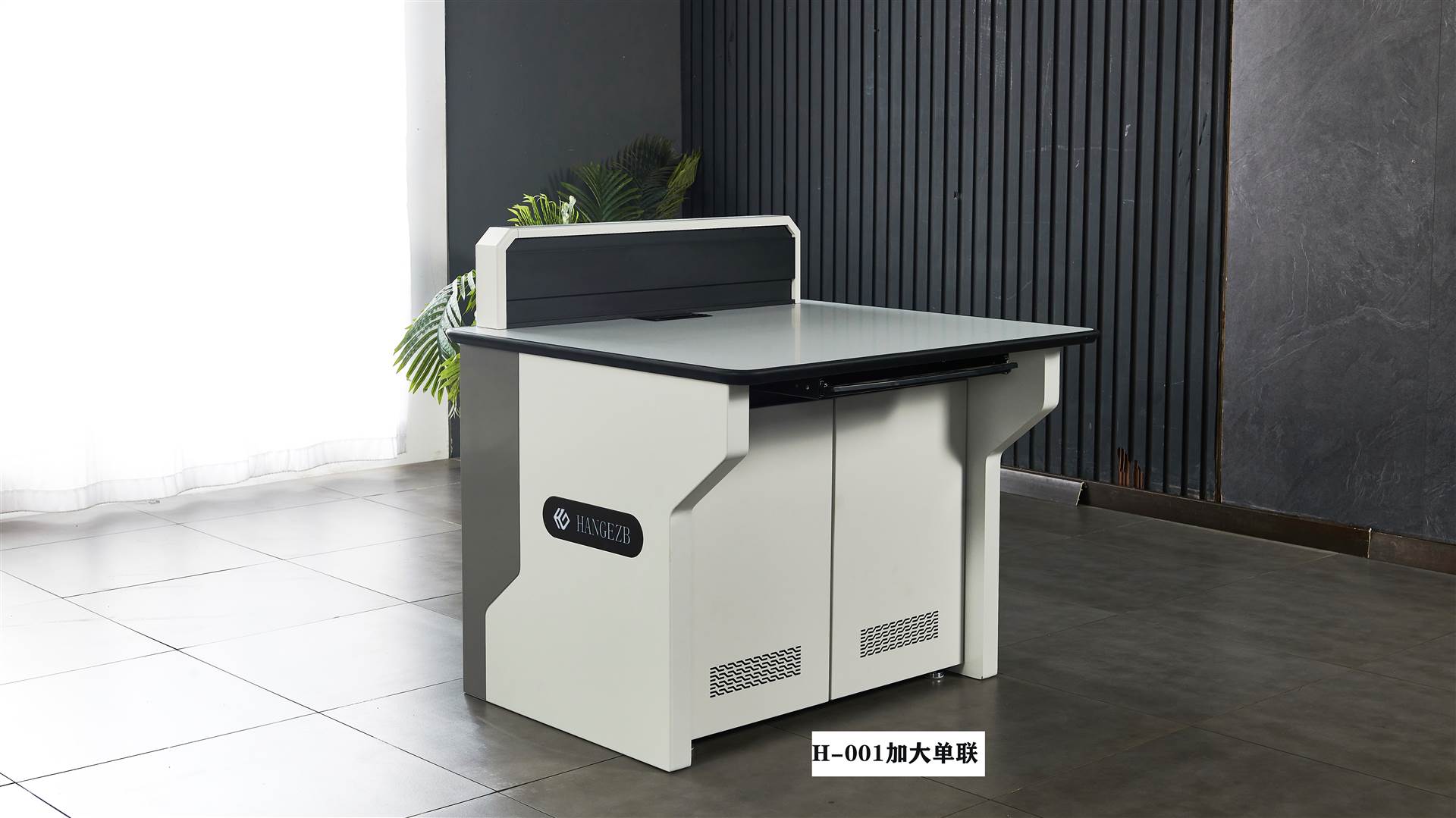 新款速拼式豪华控制台,框架采用卡扣加螺丝组装方式,使安装更加快捷框架更加牢固,多工位随意组合,台体底座装有可调节水平地脚支撑,下底配有封闭盖板,盖板上预留有86插座孔和布线孔,盖板下面装有横向布线槽,使控制台的布线更加规整和安全。操作台面选用25厚E0级肤感实木颗粒板,前端镶嵌黑色橡胶扶手。左右侧板使用50mm厚密度板喷涂金属漆,侧板铭牌可定制。铝型材屏风高度200mm,可以安装各型号显示器支架。金属框架选用冷轧钢板,整体框架厚1.5mm,前后门板厚1.0mm,铝型材厚度2.0mm,操作台所有金属构件表面柔性哑光涂层。