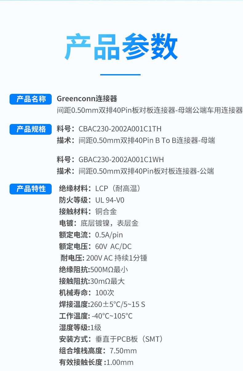 greenconn间距0.50mm双排40P板对板连接器 母端公端车载连接器组合