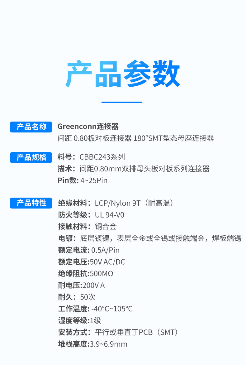 Greenconn连接器间距 0.80板对板连接器SMT型态公座连接器