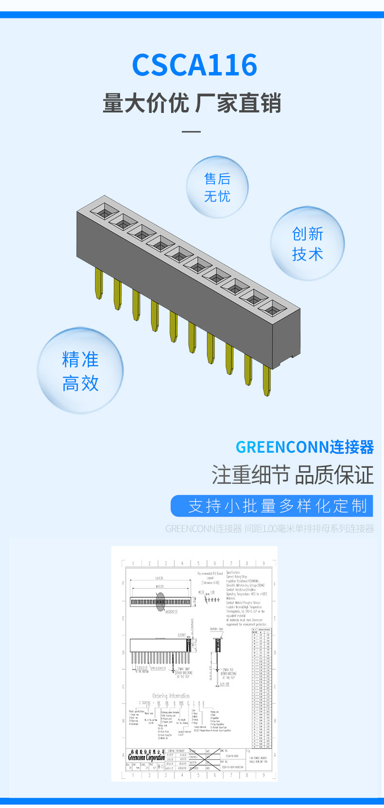 Greenconn连接器排针单排1.00间距直针型态2P-40P排针连接器