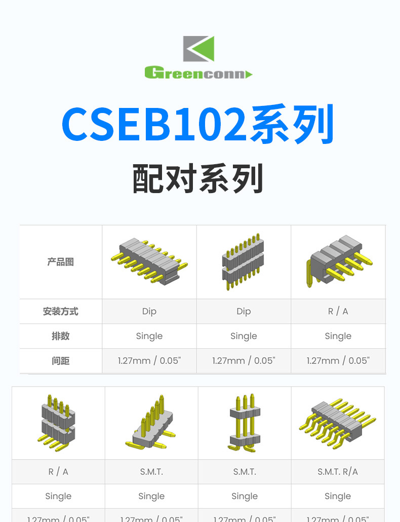 greenconn排针 Pin距1.27mm双排单塑2-50Pin垂直于PCB板排针连接器