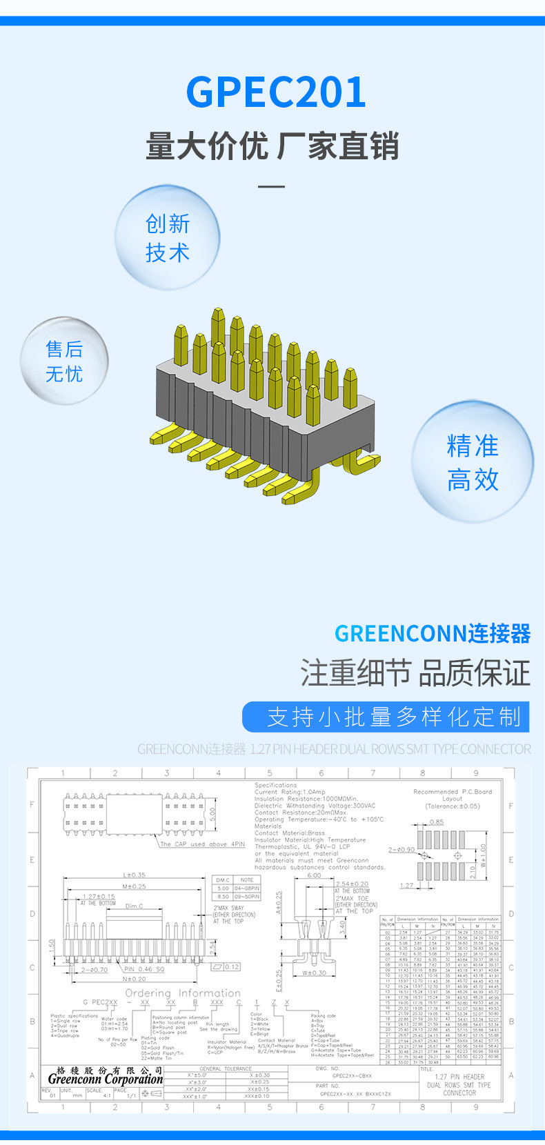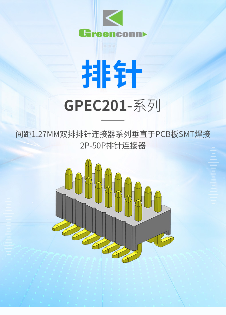 Greenconn间距1.27mm双排排针连接器系列2p-50p垂直于PCB通孔焊接