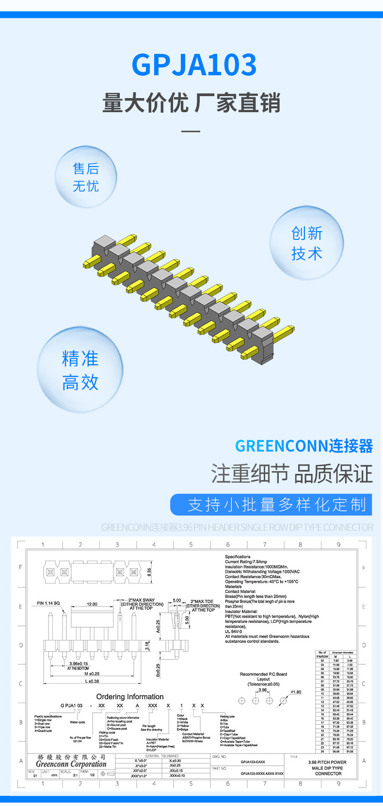Greenconn连接器排针单排1.00间距直针型态2P-40P排针连接器