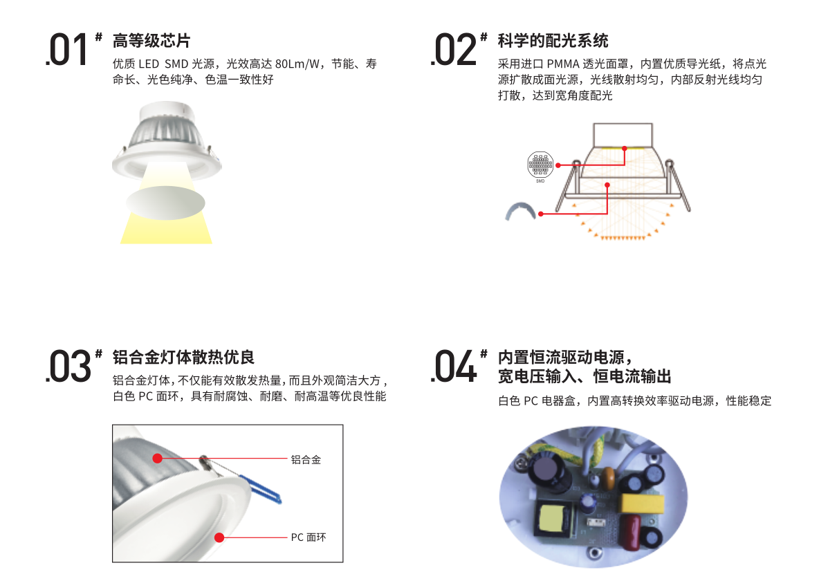 选用 LED SMD 芯片,光效高,色温一致性好;